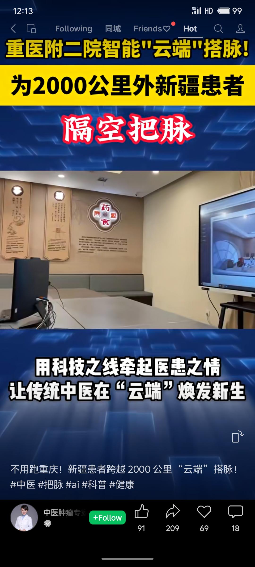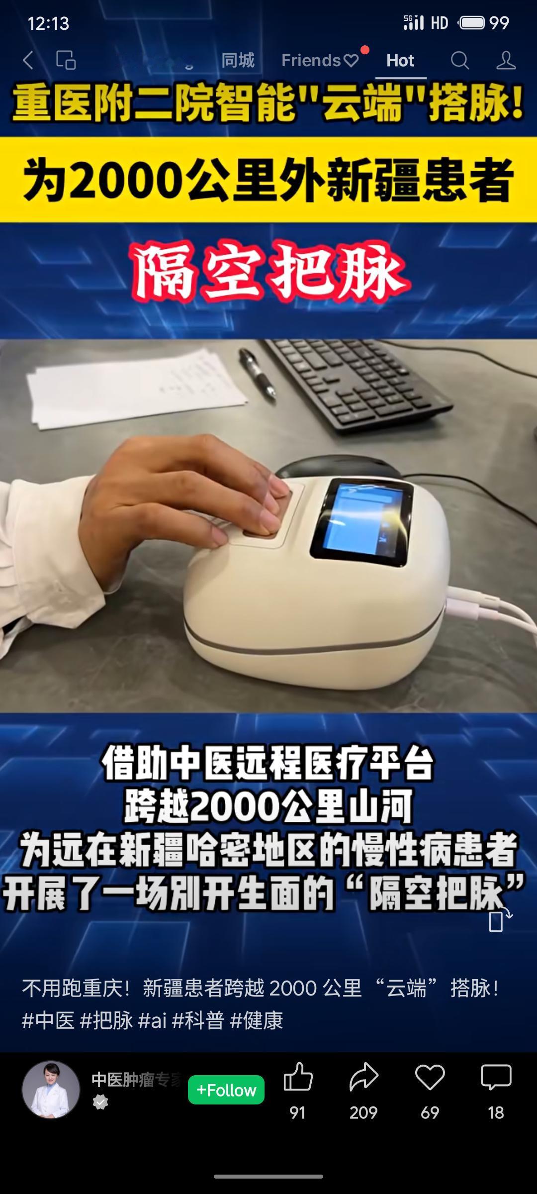 重医附二院通过智能“云端”中医系统,为2000公里外新疆哈密的患者实现远程把脉,借助科技手段让传统中医突破地域限制,为慢性病患者提供创新诊疗服务。
