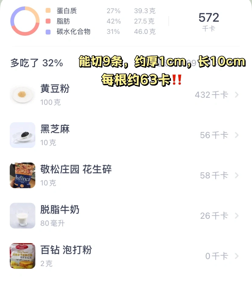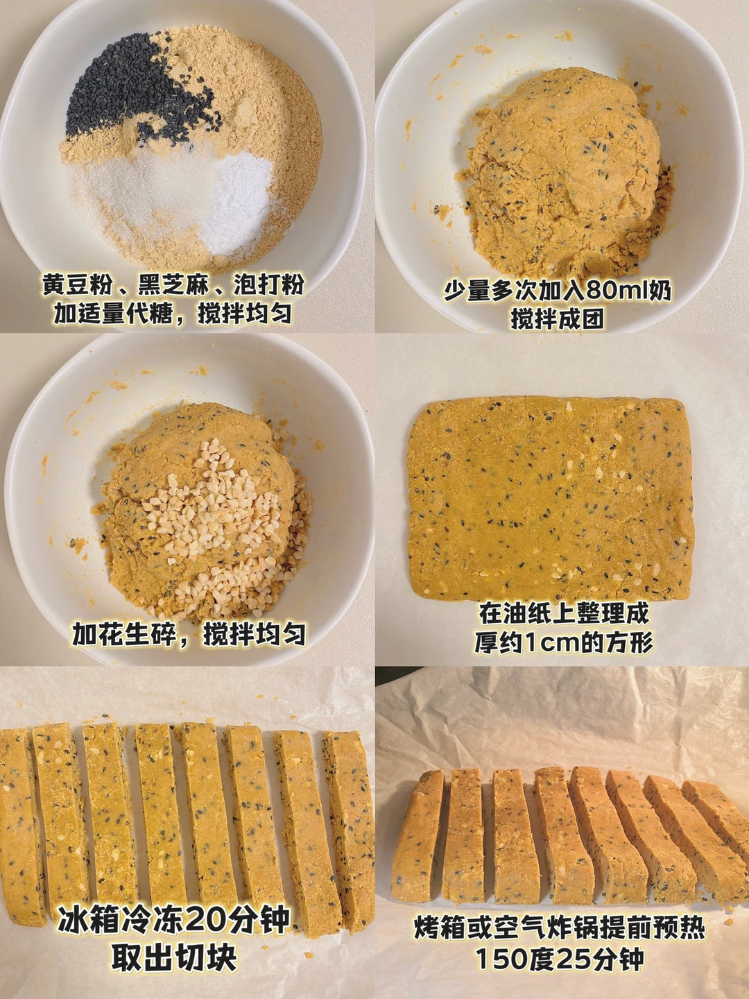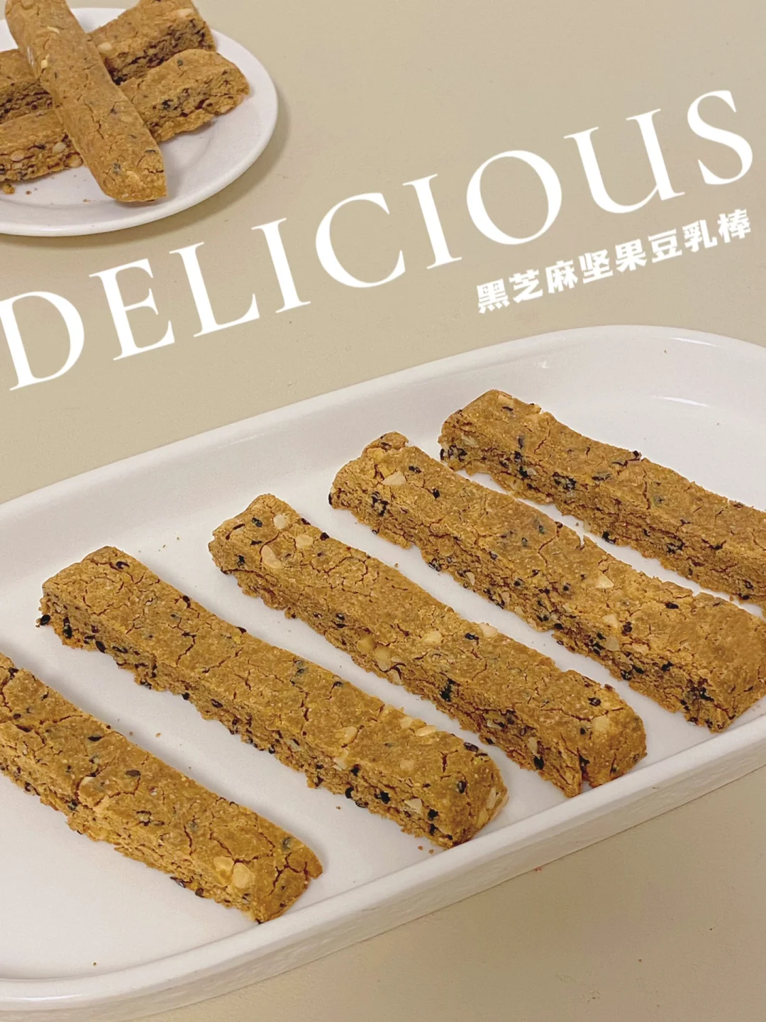 👩‍🍳消耗下家里的黄豆粉,做个解馋小零食-坚果豆乳棒‼️无糖油无面粉,黄豆粉和坚果的组合,香迷糊了‼️ 💕 63卡/根|烤箱/空气炸锅都🉑️ 🌈适合减脂、健身、豆乳控、爱吃零食的宝‼️ . 🍃食材(572卡-9根 👉附热量表): 熟黄豆粉100g(🉑️换豆浆粉) 黑芝麻10g(🉑️不放) 奶80g 泡打粉2g 花生碎或核桃碎适量 🌈代糖的量自己✋~液体少量多次加 . 📖简单步骤一看就会,直接翻图6⃣️ . 食材简单,美味不简单‼️ 该说不说,很像之前的网红零食-无油小钢筋,但是会更酥软些,蘸酸奶别有风味,解馋还能防暴食‼️ 🌈姐妹们都要多吃不胖!