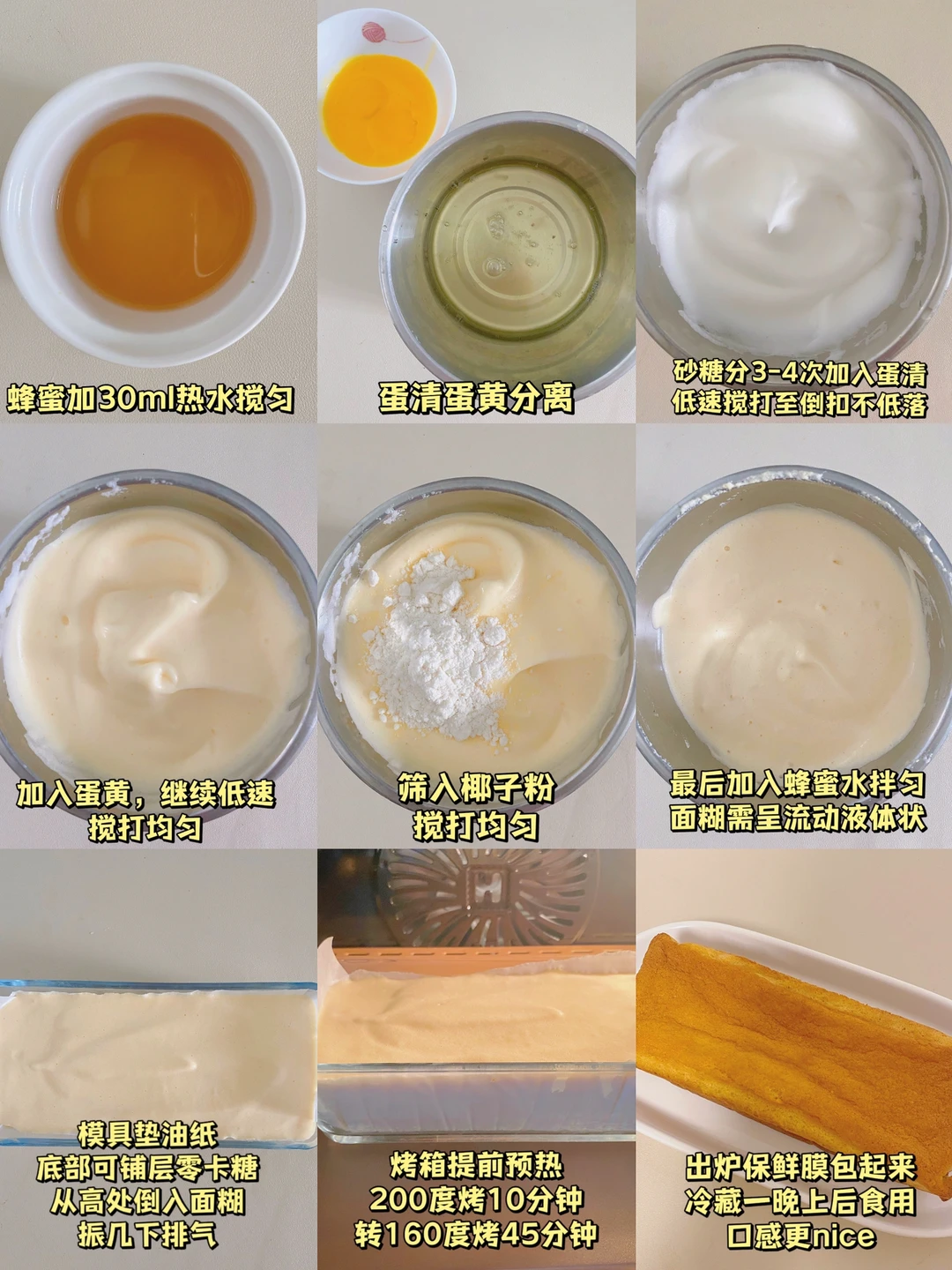 👩🍳日本福砂屋蜂蜜长崎蛋糕🔥复刻版,无油无面粉,老人小孩都爱吃‼️ 💕33卡/块(10-12块) 🌈减脂、健身、甜品蛋糕脑袋都给我去做‼️ . 🍃食材(335卡-23*10*6模👉附热量表): 椰子面粉20g(🉑️换高筋粉) 鸡蛋3个 蜂蜜20g 热水30ml 🌈代糖的量自己✋~ . 📖简单步骤一看就会,直接翻图7⃣️ . 食材简单,美味不简单‼️ 做早餐或下午茶,配咖啡或牛奶,就很nice‼️一份可够2-3人食~记得用保鲜膜包好冷藏储存哦~ 🌈姐妹们都要多吃不胖‼️