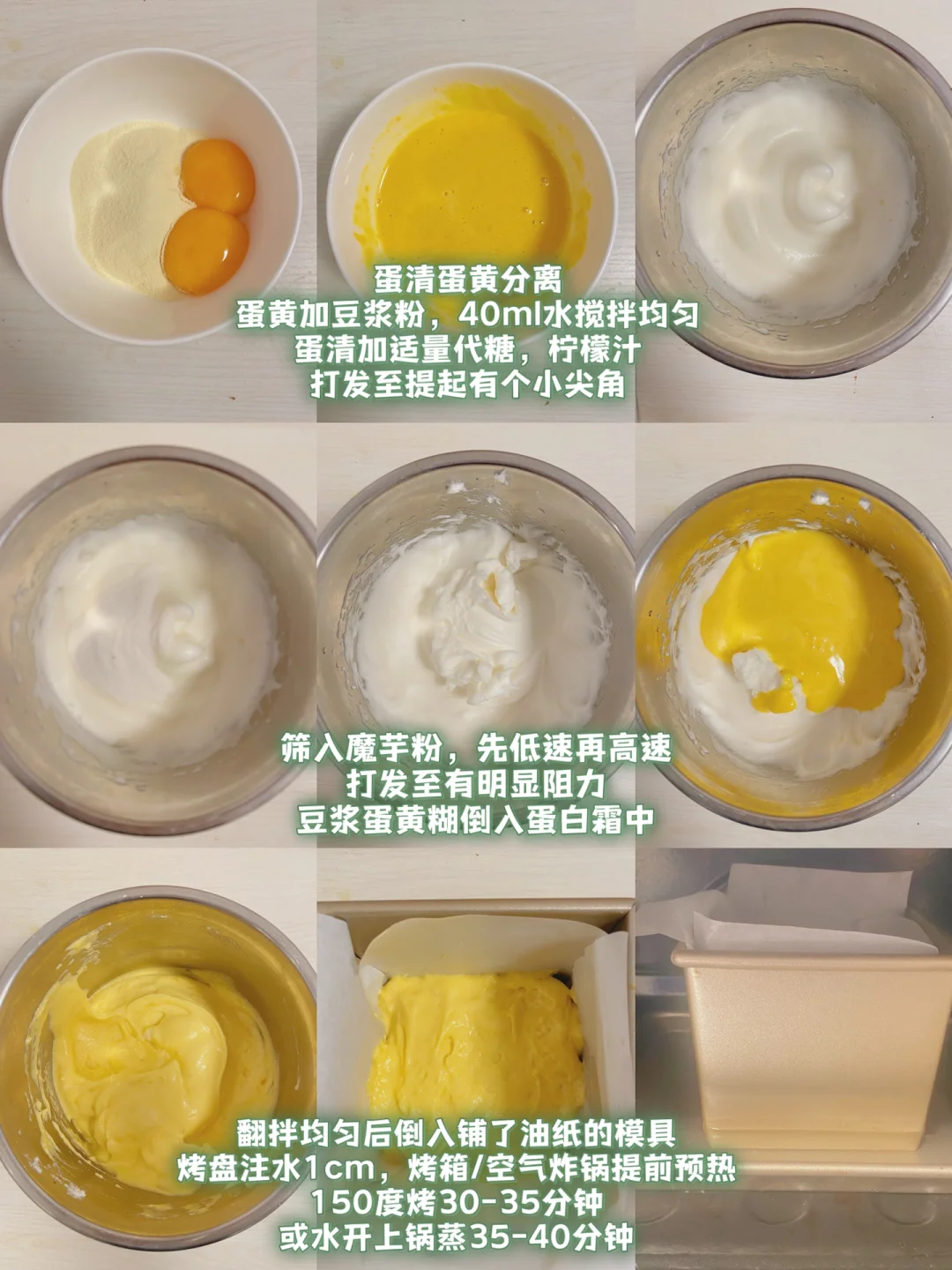 👩🍳家里有豆浆粉的看过来,无糖无油无面粉的古早豆乳蛋糕,都给我去做‼️duang~duang的,松松软软,不塌腰,超好吃‼️ 💕35卡/块|烤箱/空气炸锅/蒸锅都🉑️ 🌈适合减脂、健身、豆乳控、魔芋蛋糕脑袋冲‼️ . 🍃食材(286卡-250g吐司模👉附热量表): 无糖豆浆粉30g(🉑️换黄豆粉) 鸡蛋2个 魔芋粉8g 🌈代糖的量自己✋;若无魔芋粉,豆浆粉用量*2 . 📖简单步骤一看就会,直接翻图5⃣️ . 食材简单,美味不简单‼️ 做早餐配咖啡就很nice,低卡又饱腹‼️