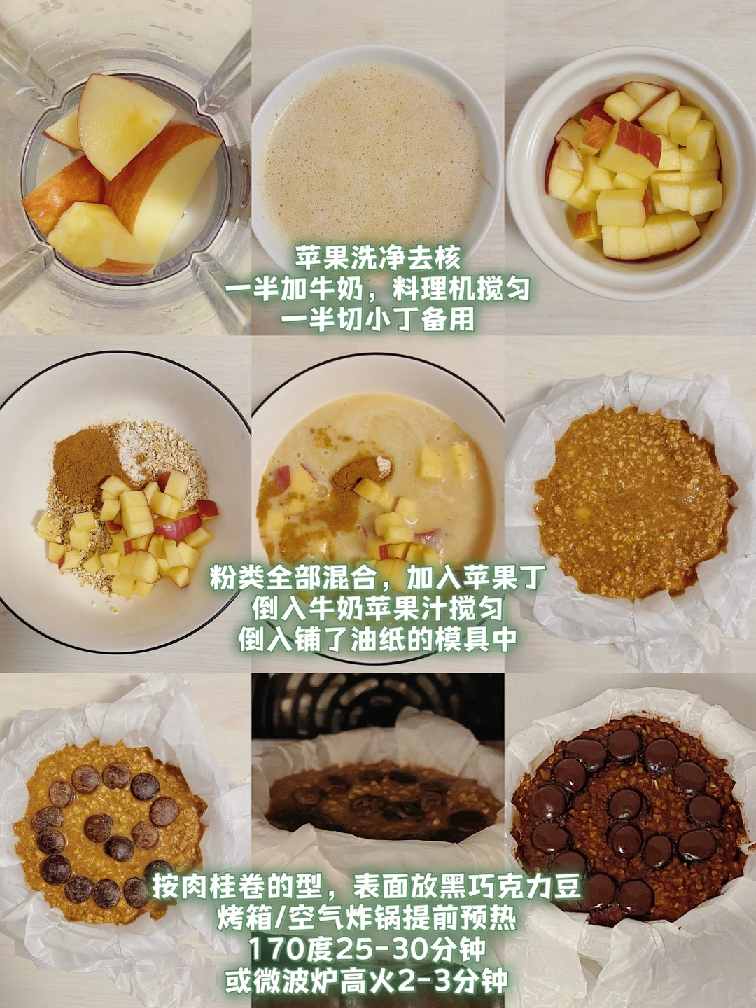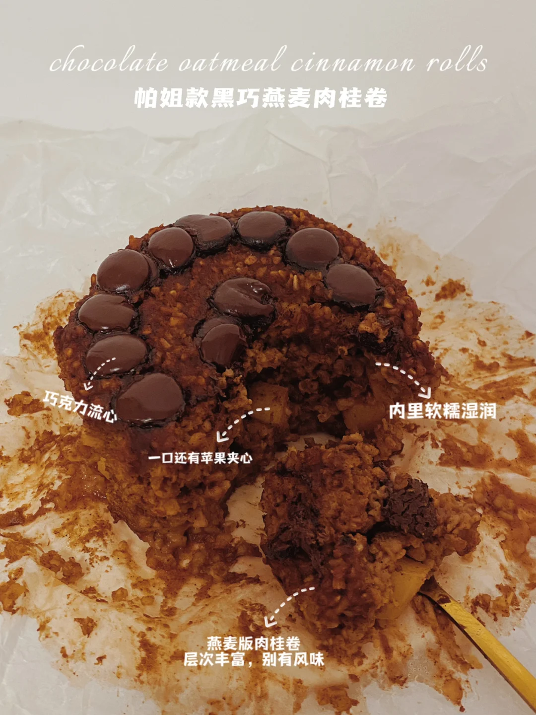👩‍🍳这个冬天谁没有为肉桂卷沦陷‼️新扒来的帕姐燕麦食谱,造型超级像肉桂卷,不需要卷,不发酵不揉面,燕麦就能做‼️ 💕328卡/份|烤箱/空气炸锅/微波炉都🉑 🌈适合减脂、健身、燕麦、肉桂卷爱好者入‼ . 🍃食材(328卡-4寸👉附热量表): 苹果1个(小) 燕麦50g 肉桂粉5g|小苏打1g 牛奶100ml 黑巧克力豆适量(约10g) 🌈帕姐还放了点肉豆蔻、丁香、八角这些香料,我没有就没放,口感也很棒 . 📖简单步骤一看就会,直接翻图6⃣️ 🌈微波炉版整体口感会更软糯些,烤箱/空气炸锅版,内里湿润绵软 . 食材简单,美味不简单‼ 做早餐真的超棒,一份饱腹感超强,胃口小的,帕姐的量会有些多,燕麦可少些‼️ 🌈仙女们都要越吃越瘦‼️