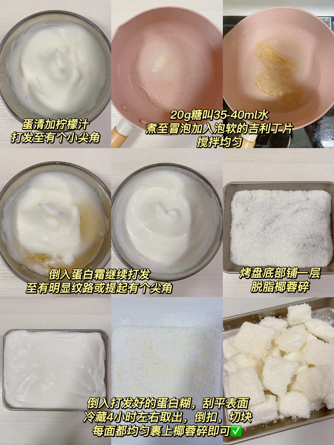 🌈若是用砂糖➕糖稀熬的水,可直接打发,无需用蛋清;椰蓉可换自己爱吃的口味,奶粉、可可粉、抹茶粉、豆浆粉都🉑️
