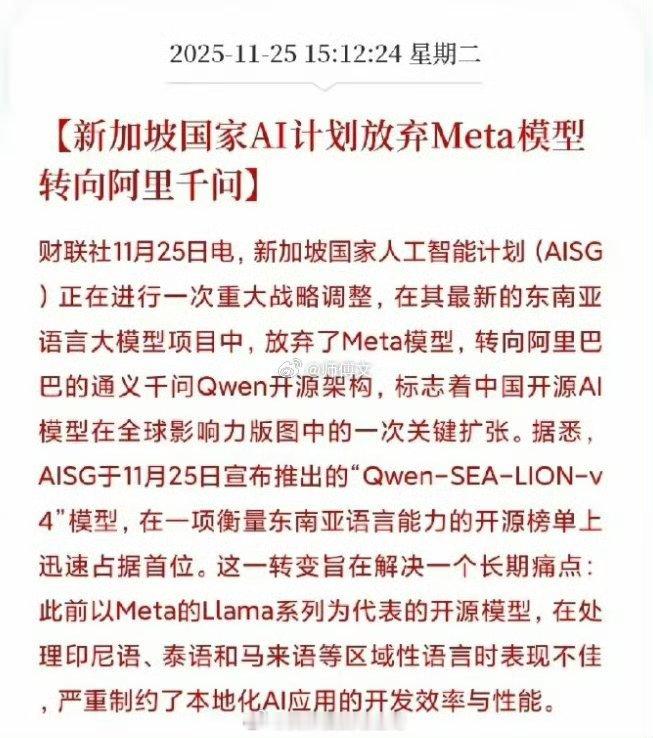 新加坡国家AI计划放弃Meta模型 转向阿里千问显然是好事儿呀,阿里在AI方面表现就是很好,全球看也是领先的,还开源,很多人都选择千问。