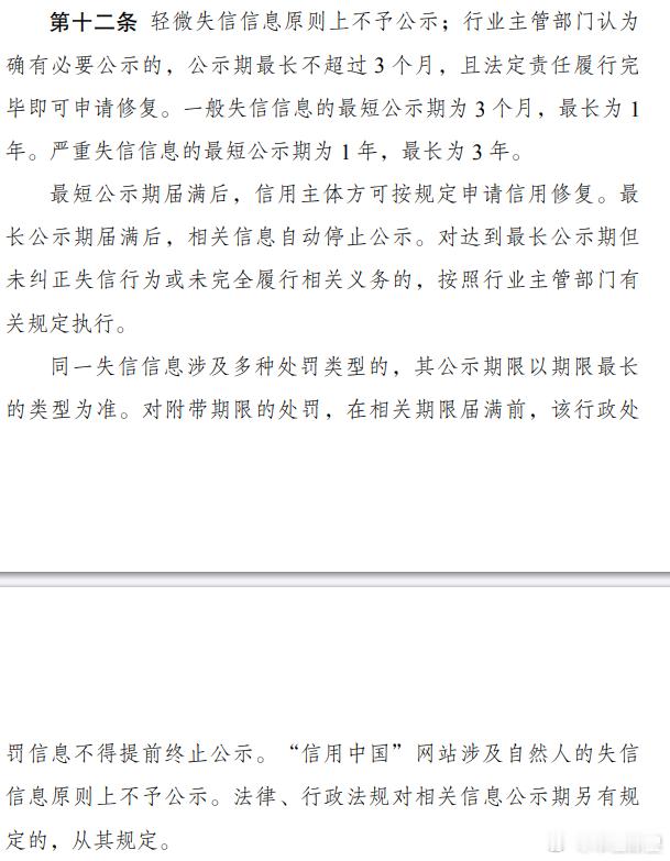 市值瞭望 据国家发展改革委11月26日消息,《信用修复管理办法》已经2025年11月19日第25次委务会议审议通过,现予公布,自2026年4月1日起施行。其中明确,轻微失信信息原则上不予公示;行业主管部门认为确有必要公示的,公示期最长不超过3个月,且法定责任履行完毕即可申请修复。(上海证券报·中国证券网)网页链接