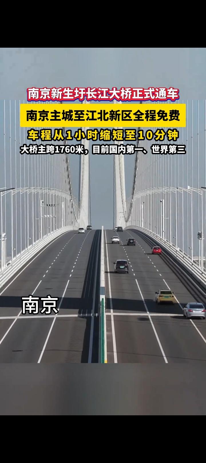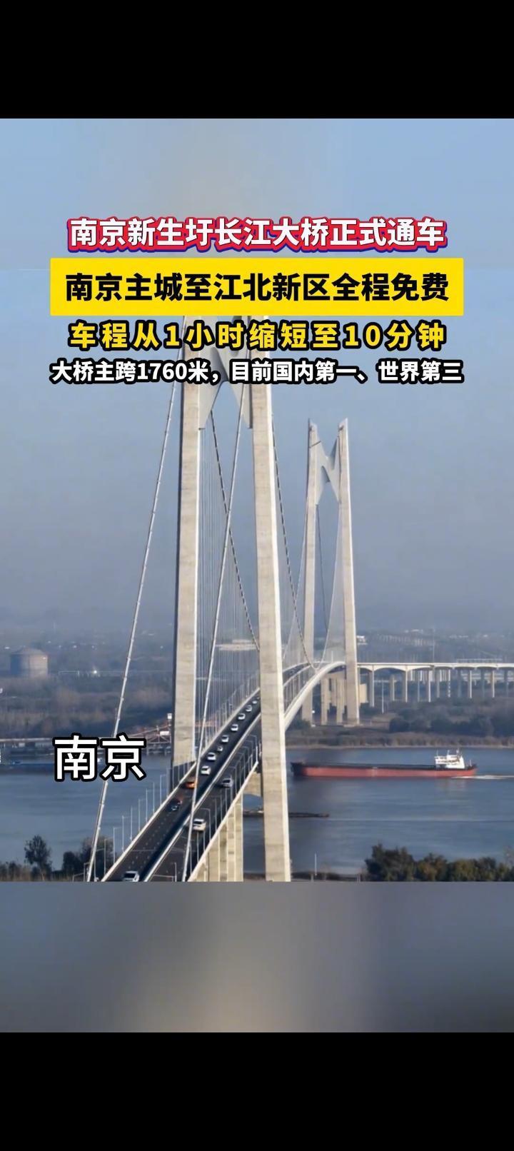 炸了!南京人等了N年的免费长江大桥今天通车!过江再也不用掏钱了! 11月26日上午9点,南京新生圩长江大桥正式通车!这座让无数市民翘首以盼的跨江通道,不仅全程免费,还一举拿下三个“身份”:国务院批复的《南京市城市总体规划》重点过江通道、主城连接江北新区的核心枢纽、南京“拥江发展”的关键新动脉。它坐落在八卦洲长江大桥(原二桥)下游6.2公里处,栖霞山长江大桥(原四桥)上游4.3公里,全长约5.8公里,双向六车道,设计时速100公里。通车当天,不少市民提前半小时守在桥头,看着第一辆私家车缓缓驶上桥面,人群中响起“通车了!免费了!”的欢呼——这座桥,终于把“过江自由”还给了南京人。 免费的桥,暖的是心!这才是咱老百姓要的“实在事”! 看到新生圩大桥通车的消息,我第一反应是翻出钱包——以前过江走二桥、四桥,来回一趟光过路费就得40块,一个月下来够给孩子买两罐奶粉了!今天起,这笔钱彻底省了,你说能不激动吗? 咱南京人太懂“过江贵”的苦了。 十年前我在江北高新区上班,家住河西,每天开车过二桥,单程15块,一个月22个工作日就是330块。有次加班忘了带钱包,在收费站急得满头汗,最后还是同事微信转账才解围。后来改走隧道,虽然不用交钱,但早高峰堵得能把早餐的油条挤成渣,有次为了赶会议,我在隧道里听了三遍《孤勇者》才挪出去——那时候总盼着:“啥时候能有座免费桥,让咱过江跟逛公园似的?” 今天,这个盼头终于落地了! 邻居王哥在朋友圈晒出账单:“以前每月过江费300多,现在全免,一年能省出一次全家游的钱!”网约车司机陈师傅更开心:“以后接江北的单子,不用算过路费成本,价格能降点,乘客也乐意坐,我这流水说不定还能涨!”你看,一座免费桥改变的哪是几块钱的事?是打工人兜里的余钱,是家庭账本上的“意外惊喜”,是咱普通人实实在在的获得感。 更让人踏实的是,这桥修得“接地气”。 选址特意避开了居民密集区,桥身加了三层隔音板,连非机动车道都铺了防滑砖——修之前开过8次居民座谈会,有人提“桥边能不能种点花”,施工队真就在匝道旁栽了一排月季;有人说“晚上开车晃眼”,设计师就把路灯换成了柔光款。有网友调侃:“这哪是修桥?分明是给咱南京人量身定制的‘过江礼物’!” 这座桥啊,更是南京“拆墙”的象征。 过去“江南江北两张皮”,江北总觉得“自己是郊区”,江南觉得“江北远得很”。现在免费桥一通,早上在江北吃碗皮肚面,中午到河西喝杯咖啡,晚上去江南看场电影——地理的隔阂没了,人心的距离就近了。就像一位江北企业家说的:“以前谈合作,客户一听地址在江北,语气都淡三分;现在大桥通了,我说‘20分钟到您公司楼下’,对方立马说‘那明天见’!” 有人说“免费桥不稀奇”,可只有咱南京人知道: 每一分钱的减免,都是政府把“民生账单”算进自己口袋的诚意。当车轮碾过崭新的桥面,我仿佛看见江北的工厂、江南的写字楼、八卦洲的果园,因为这桥连成了“一家人”的模样——这哪是座桥?是南京给咱老百姓的“定心丸”,是城市长大的“里程碑”! 桥通了,日子就顺了 新生圩长江大桥的通车,不是简单的“多了一条路”,是南京把“以人民为中心”写进了江底,刻在了桥墩上。它告诉我们:好的城市发展,从来不是建多少高楼大厦,而是让每个普通人都能感受到“日子越过越轻松”。从前“过江要算计”,如今“过江随心意”,变的不仅是速度,更是咱南京人对“美好生活”的信心。 你家住在江北还是江南?通车后最想做的第一件事是什么?是带爸妈去江北摘草莓,还是约朋友去江南喝下午茶?欢迎在评论区聊聊你的“免费过江计划”! 南京新生圩大桥免费通车 过江自由了 南京拥江发展加速度