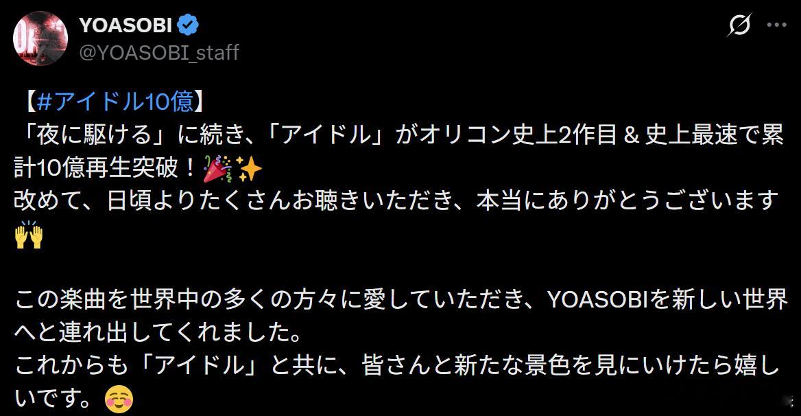 YOASOBI的《アイドル》在26日公布的最新Oricon周间流媒体排行榜中,成为继《夜に駆ける》之后,Oricon史上第2首、史上最快达成累计播放量突破10亿的作品。该曲周间播放量为170万3028次,累计播放量达到10亿12万6379次。自2023年4月24日该曲在同排行榜首次进榜以来,仅用137周便突破10亿播放量,在“10亿播放量突破所用周数”一项中位列历代第一,创下Oricon史上最快纪录。