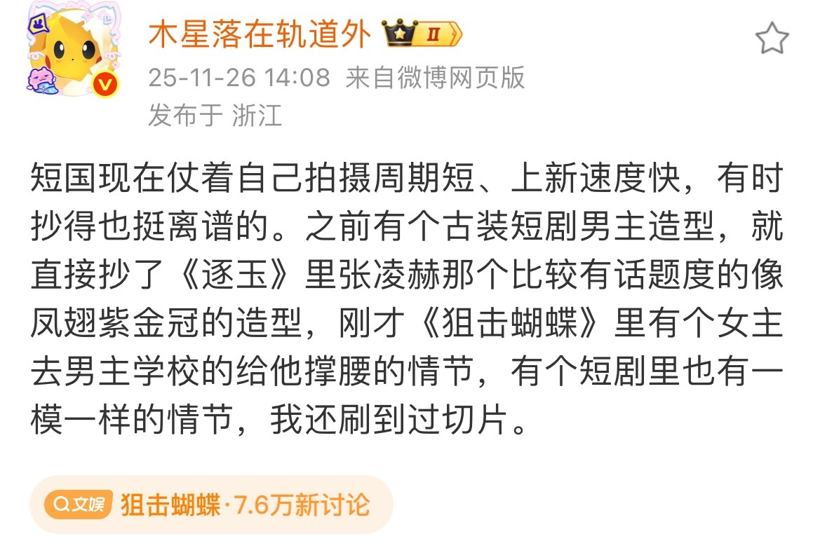 作为一个编剧,我对短国最失望的就是全特么是融梗、抄袭,受众不但溺爱还猛夸造型抄袭、BGM随便用暂且不论剧本直接融梗,精华都是融的根就烂了今天狙击蝴蝶这个我也觉得被融得太明显了……之前还有一部照抄《装腔启示录》名场面这些导演和编剧真的以为没人说吗