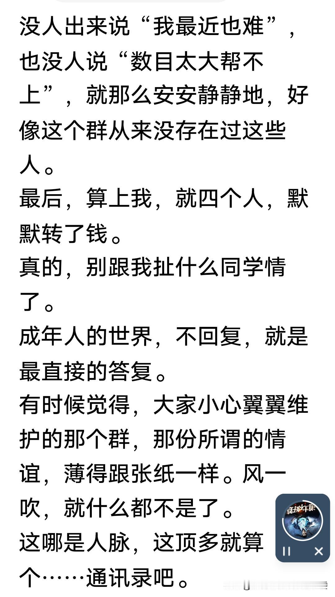水滴筹一事,着实令人感慨。见到真正困难的求助者,我总会尽力相助,毕竟谁都有难处。但有些生活优渥之人也来蹭求助热度,实在有失妥当。 更恼人的是自己大手大脚的花钱如流水,一旦有事就打电话让这个帮忙,那个帮衬。接到电话我都明确拒绝,有的发短信借钱,都没办法回复,其实成年人的世界,不回复就是最好的回复。