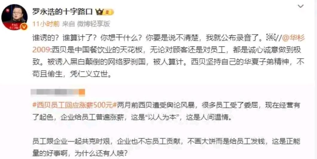 近日,西贝员工回应涨薪500元的话题引发关注后,西贝品牌顾问、华与华创始人华杉在微博发声称西贝“被人算计”,引发新一轮争议。11月26日凌晨,罗永浩转发该微博回怼,质问“谁算计了?你想干什么?你要是说不清楚,我就公布录音了”。 这并非双方首次交锋。9月西贝“预制菜”风波中,华杉曾多次发文力挺西贝,指责罗永浩“污蔑”,称贾国龙要“硬杠网络黑嘴”。随后罗永浩在直播间批评华与华作为品牌顾问鼓动西贝硬刚是“扯淡”,不久后华杉道歉,事件暂告一段落。华与华自2013年起与西贝合作,打造了“I♥莜”超级符号、精简菜品等多个营销成果。 部分网友留言表示,西贝刚有缓和,华杉的言论又让其陷入争议。 作为品牌顾问,华杉的言论本应维护合作方形象,却多次引发争议,反而给西贝带来负面影响。商业合作中,双方应理性沟通解决分歧,盲目发声不仅不利于问题解决,还可能损害品牌公信力,最终得不偿失。 友友们觉得呢?