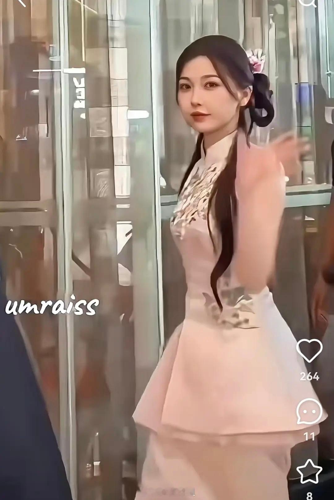 虞书欣第二套妆造来了,也是旗袍装,只是这一套是绿色带闪片的,看起来耀眼多了,客观