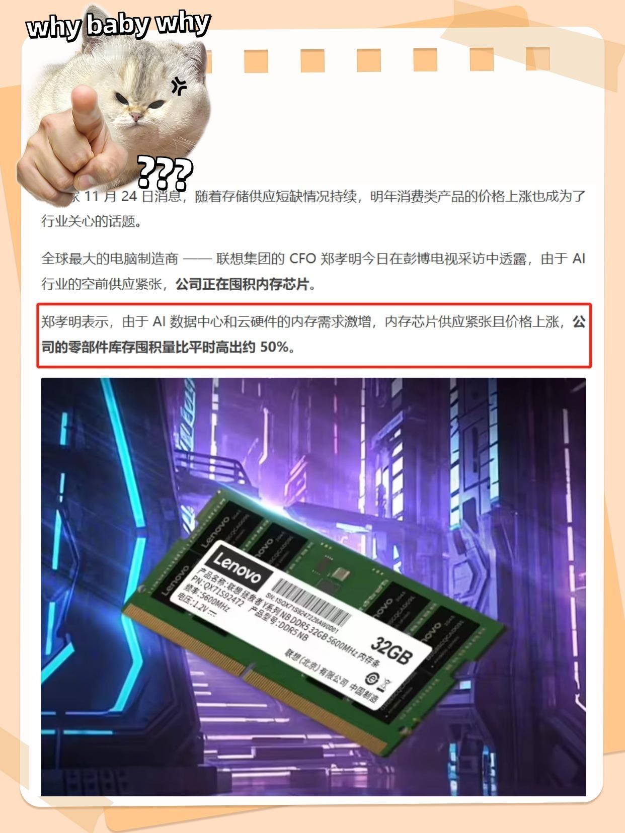 不敢想象明年电脑价格会涨成什么样!! 连联想老总都放话了,现在AI一火,内存、闪