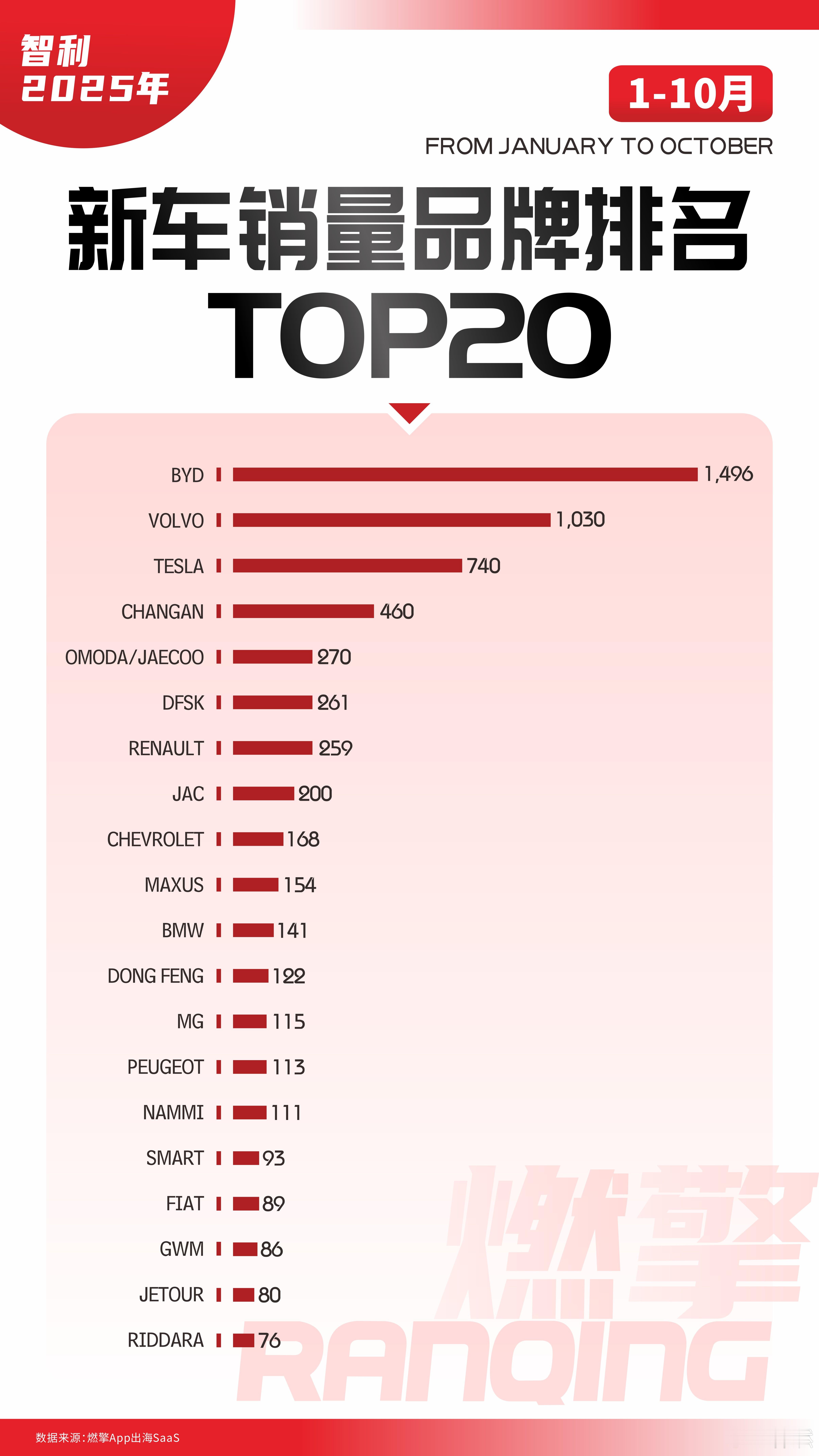 智利新能源车市:比亚迪稳居首位1-10月,智利新能源车型市场展现出以中国品牌为主导的发展格局。比亚迪凭借显著优势位居销量榜首,多个中国品牌在不同细分市场积极布局,而豪华及传统品牌则表现相对有限。这一市场特征与智利新能源市场起步阶段注重实用性与性价比的需求特点高度契合。比亚迪以1496辆的累计销量稳居首位,较第二名沃尔沃领先近500辆。其元PLUS、汉系列等纯电车型既能满足城市通勤需求,部分SUV车型还可适应智利山地路况。配合全面的配置与相较于欧美品牌更具竞争力的价格,精准把握了当地消费者注重实用价值、不盲目追求品牌溢价的购车心理,成为智利新能源市场的领先品牌。除比亚迪外,长安、OMODA/JAECOO、DFSK等中国品牌也在各自领域取得进展:长安凭借经济型纯电车型服务预算有限的通勤用户;OMODA/JAECOO以年轻化设计吸引入门级家庭消费者;DFSK则专注于商用新能源车型,满足小型商业运输需求。这种多品牌、多车型的协同布局,使中国品牌在智利新兴新能源市场中占据了重要地位。相比之下,豪华及传统品牌的市场表现相对有限。沃尔沃依靠安全口碑与新能源车型位居第二,但销量规模仍不及比亚迪;特斯拉仅实现740辆的销售成绩,显示其品牌溢价在当地市场认可度有限;雷诺、雪佛兰等传统品牌的新能源车型销量也处于较低水平。这表明当前智利新能源市场仍以性价比为导向,豪华品牌的高端定位与传统品牌的新能源产品策略尚未获得主流消费者广泛认可。比亚迪的领先地位预计将持续巩固。其他中国品牌如能继续保持高性价比优势,也将在各自细分领域获得更多发展空间。大v聊车