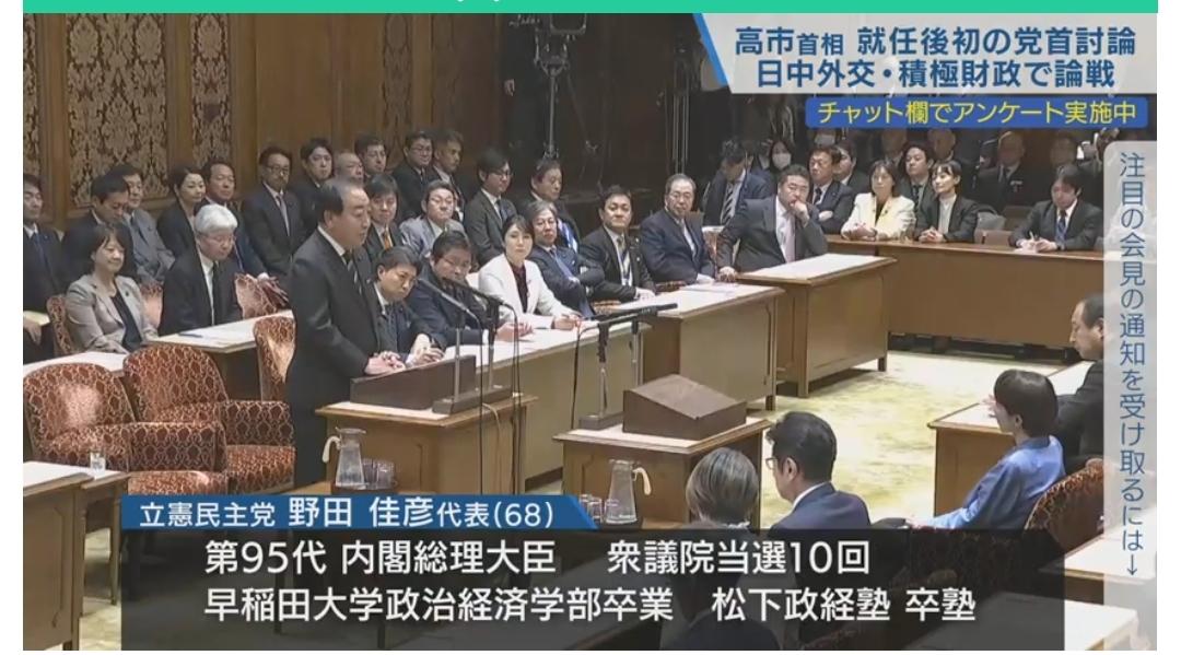 就在刚刚 高市早苗又一次公开回应涉台错误言论:拒绝撤回 11月26日,日本国会内阁举办了高市早苗担任首相以来第一次党魁辩论,此次辩论共计45分钟,着重讨论了当前中日关系问题,最终得出的结论是“拒绝撤回涉台错误言论,理由是该言论是根据每起事件作出的综合判断”。 辩论中,日本立宪民主党党首野田佳彦对高市早苗的“涉台错误言论”进行了询问,此前野田佳彦一直说“无论怎么看,都是首相用力过猛挑起的事端,继续向中国说明本意,以及日本的官方立场,这很重要,首相应该努力改善中日关系”。 本以为这次高市早苗会对此前的鲁莽行为有所软化,没想到高市早苗明确表态:“日本政府的统一立场与我之前的回答一致,不会多也不会少。”也就是说,高市早苗拒绝撤回错误言论。 也就是说,此前特朗普给高市早苗打去的那一通电话基本没起作用,中日的关系恶化可能是长期性的,我们也要做好相对应准备,放弃幻想,准备战斗吧,这次日本肯定是有备而来,一定要警惕、警惕、警惕。