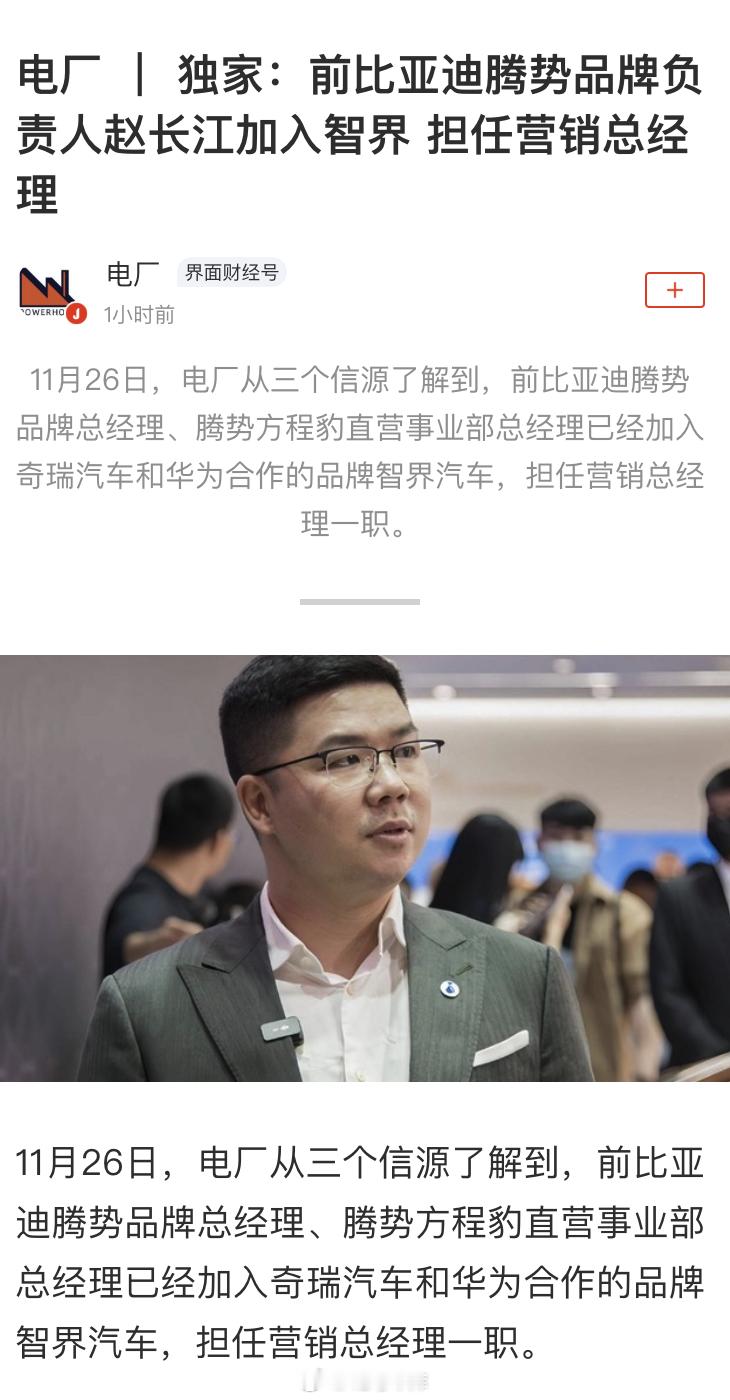 前比亚迪赵长江加入智界之前就有小道消息,看来是确定了。赵长江之前在腾势时,就