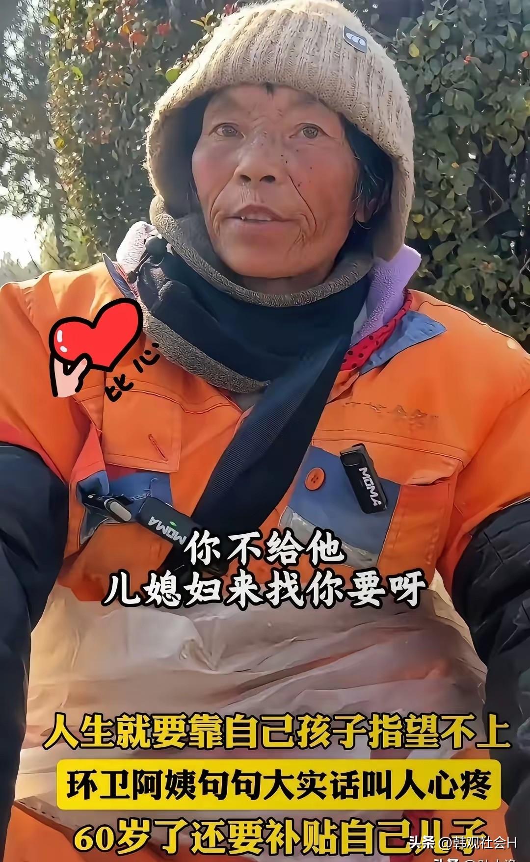 保洁阿姨刚领到工资,儿子就来找她要钱,阿姨这样感叹:人生只能依靠自己,孩子指望不上!你不给他,儿媳妇找你要呀…… 看到这张图片,有网友在评论区这样留言:老人辛苦一个月就赚两千多块钱,还被儿子拿走,这个儿子做的也太过分了! 其实,这不是个例,不知道有多少在保洁、环卫岗位上工作的老人向这位阿姨一样,为了补贴孩子才去挣钱,六七十岁的年纪仍然没黑没夜的在艰苦的环境干。他们每月拿着最低的工资,不舍得休息一天,每月工资发后,自己不花一分钱,就直接把工资交到儿子的手里。 其实,这不能怪儿子没有担当,也不能怪儿媳逼着要钱,更与儿子孝不孝无关,年轻人的压力太大,他们也太难!可怜天下父母心,相互理解吧!
