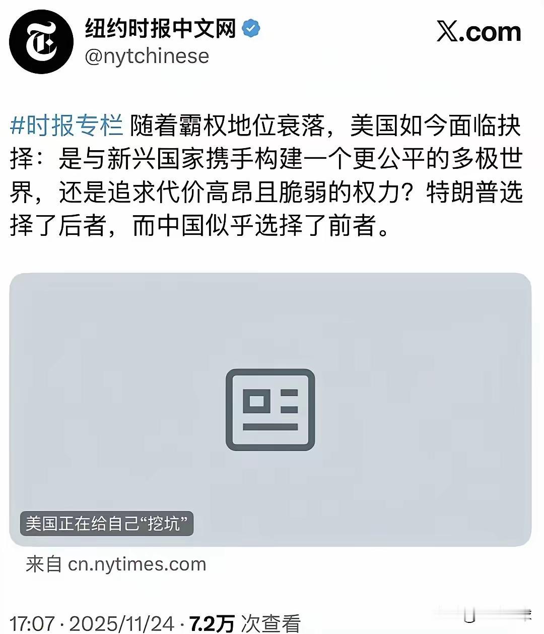 纽约时报:随着霸权地位衰落,美国面临抉择:是与新兴国家构建一个更加公平的多级世界还是追求代价高昂且脆弱的权力? 权力是比毒品让人更上瘾的东西。美国习惯了权力,它怎么可能选择去和别的国家分享权力,与新兴国家构建一个更加公平的多极世界呢? 纽约时报指责特朗普选择了追求代价高昂而脆弱的权力,其实换谁来当这个总统都会是和特朗普一样的选择。权力越大,惯性越大。在权力逐渐衰落的时候巨大的惯性列车会带着美国一直走下去,直到它再也没有掌控世界的可能它才会放弃对权力的追逐。