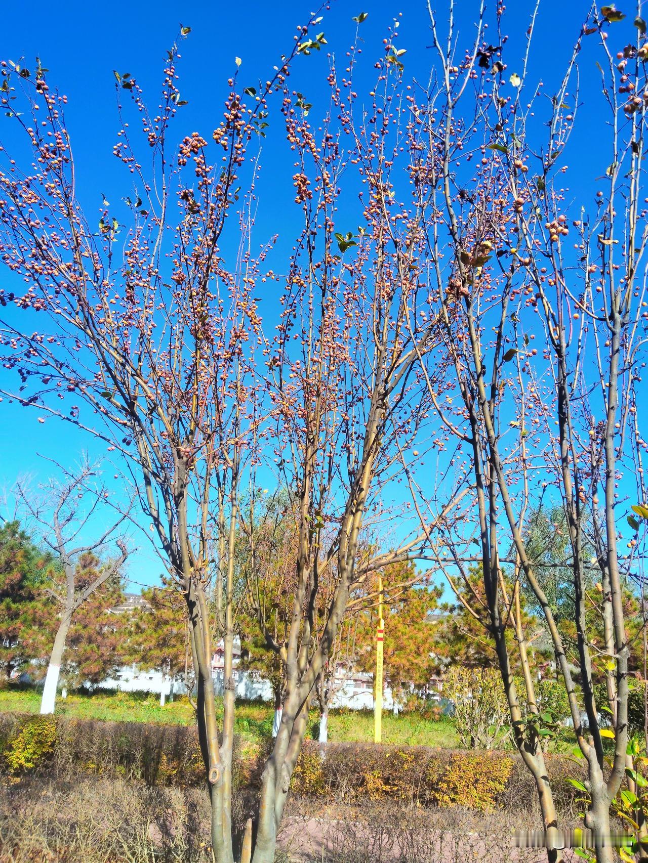 初冬,陇西的天空一片瓦蓝。蓝天下的法桐,色彩斑斓。西府海棠,果实累累。西府海棠的果实,据说可以做浆果。哪天采来试一试。