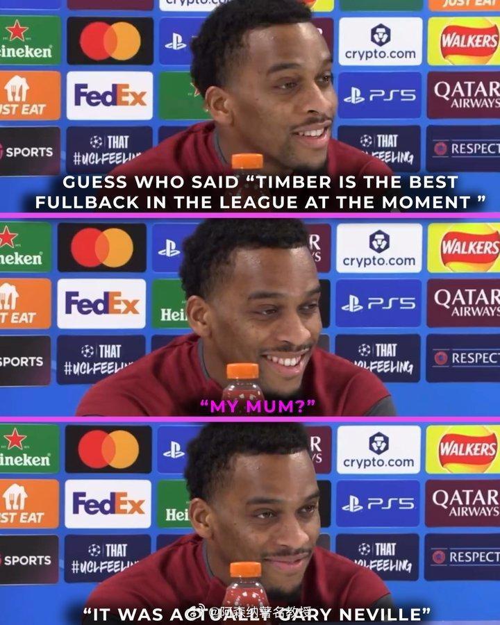 廷伯式幽默:猜猜是谁说廷伯是目前联盟最佳边后卫?我妈妈?其实是加里·内维尔 金秋观赛季 阿森纳著名教授