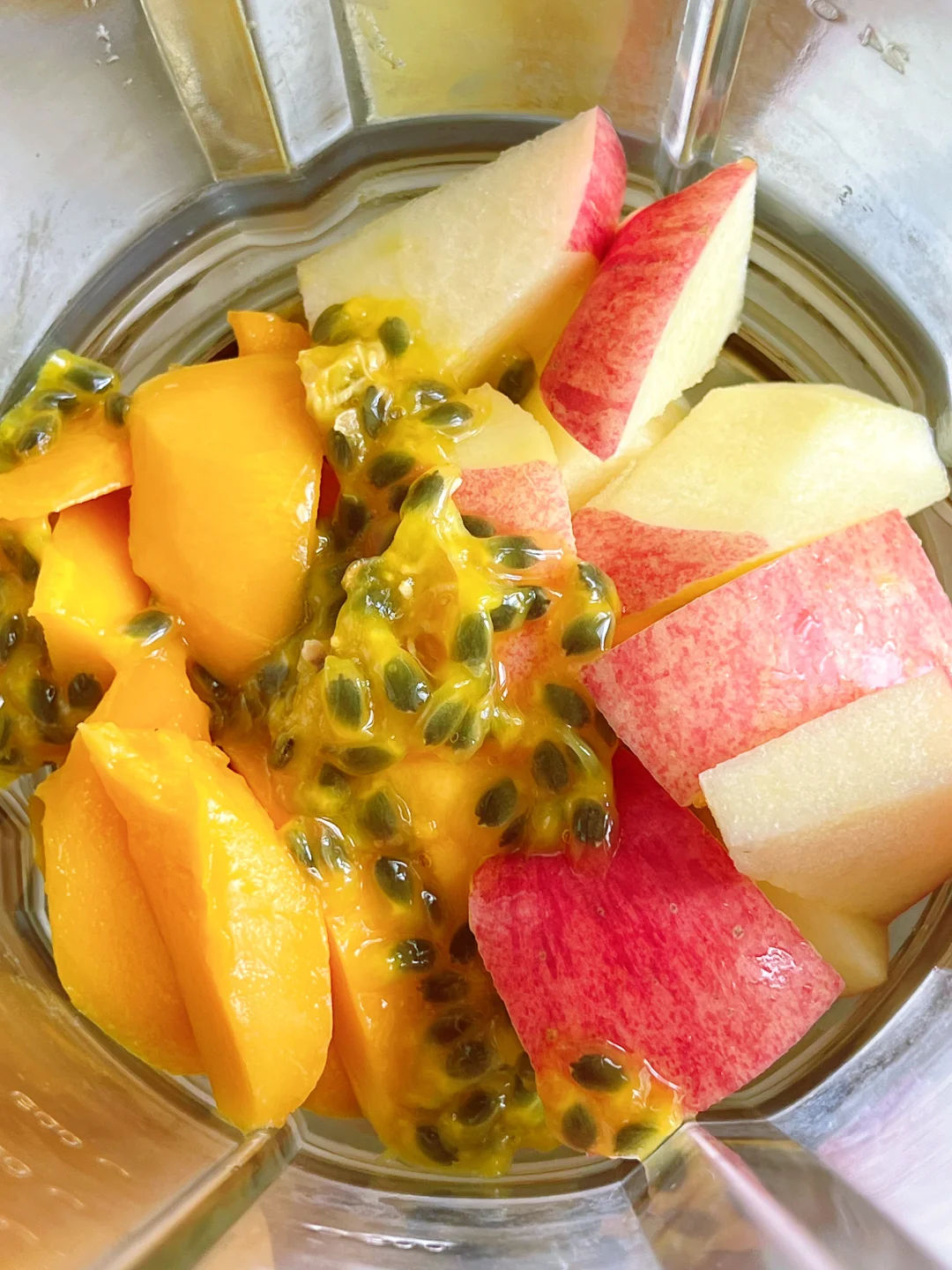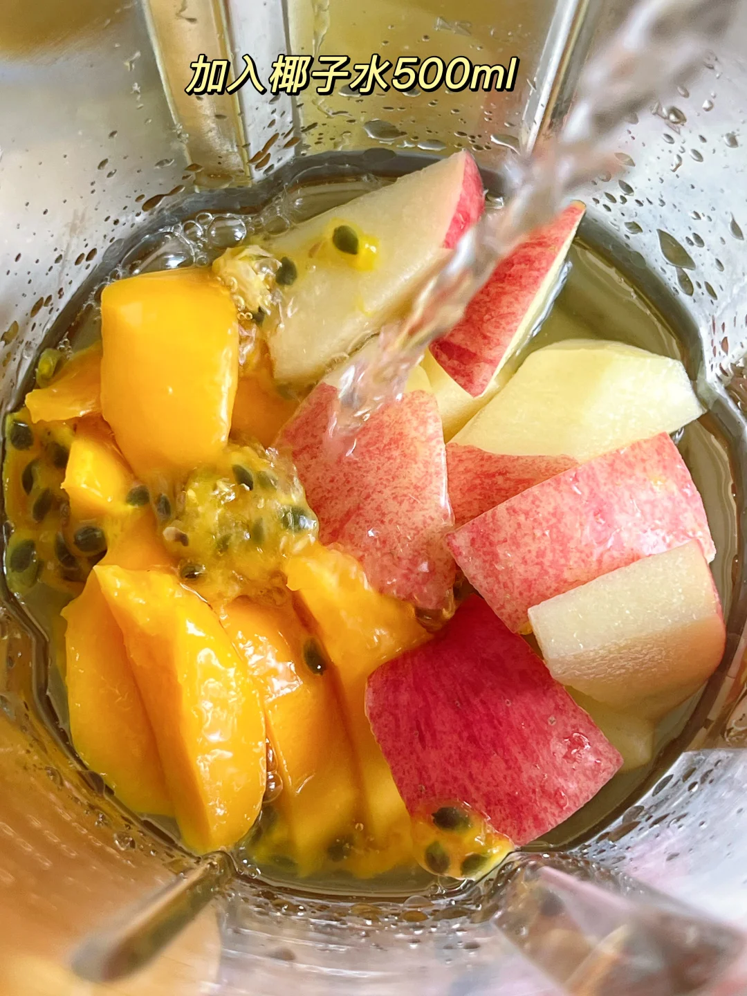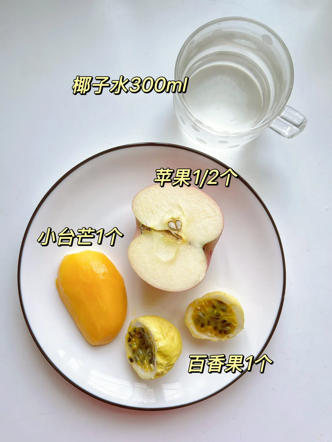 吃了甜食会开心 在wagas里,这款饮品叫“热带雨林” 我想是因为里面用的都是热带水果吧 就和色彩一样 口感甜蜜和热烈 食材:(1杯) 小台芒1个 百香果1个 苹果1/2个 椰子水300ml 水 做法: 1️⃣百香果取果肉,苹果去核,芒果去核去皮 2️⃣所有食材放入破壁机,果汁模式即可