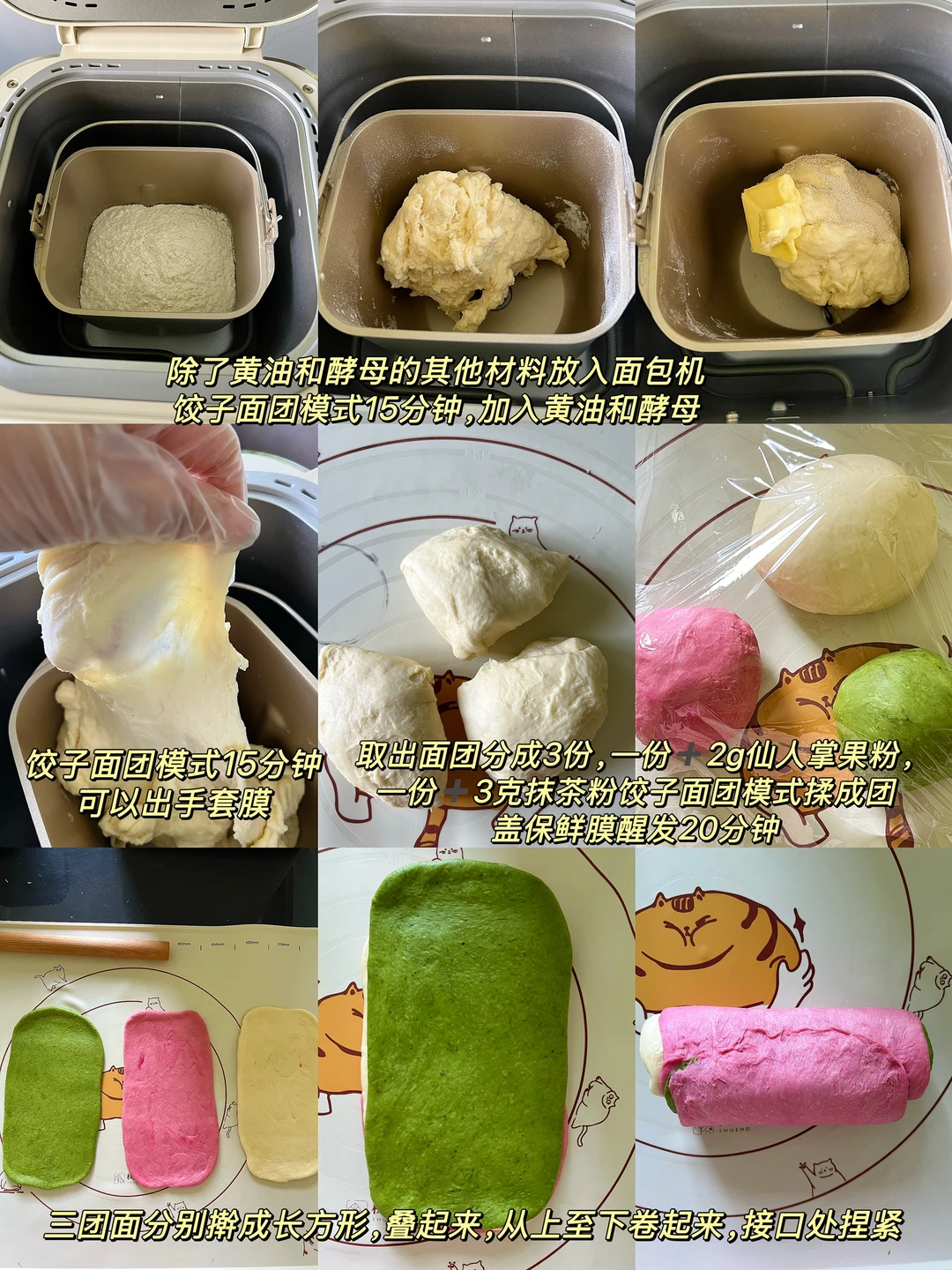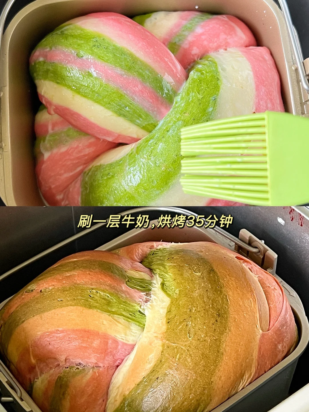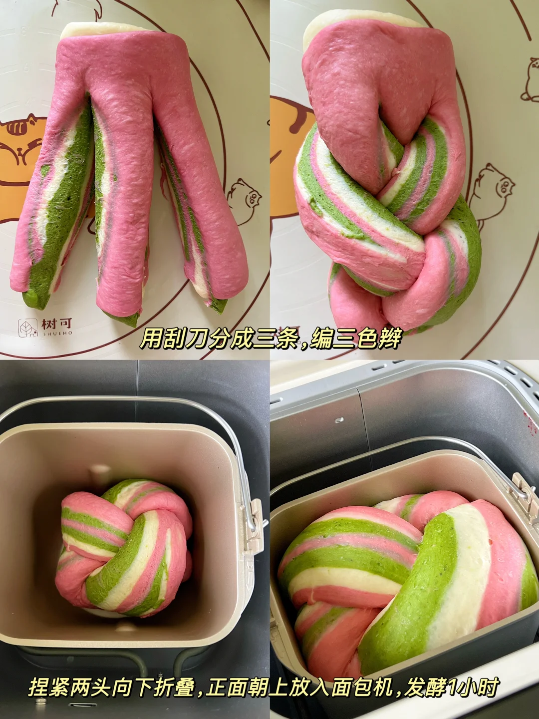 4️⃣三团面分别擀成长方形,叠起来,从上至下卷起来,接口处捏紧 ,用刮刀分成三条,编三色辫,捏紧两头向下折叠,正面朝上放入面包机,发酵1小时,刷一层牛奶,烘烤35分钟即可
