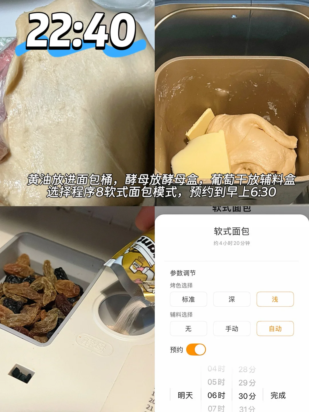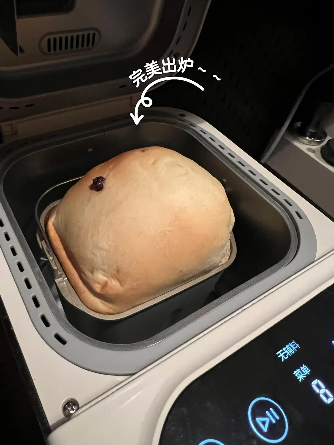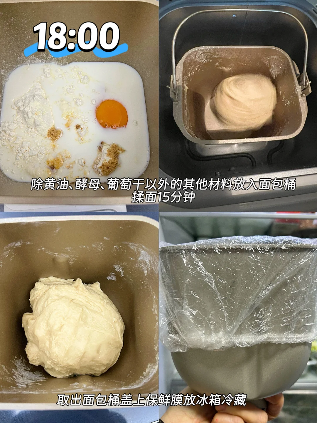 面包机食谱 躺在被窝里闻到了面包的香气是一种什么感觉? 是幸福呀! 听到滴滴的声音,迫不及待的跑出卧室 又是一个完美大爆头👏👏 📝室温21度 食材: 高筋面粉 260g 奶粉10g 冰鸡蛋1个 冰牛奶150g 红糖25g(白砂糖也可 盐3g 黄油 25g 耐高糖酵母 3g 葡萄干60g 过程: 1️⃣晚上18:00: 除黄油、酵母、葡萄干以外的其他材料放入面包桶,揉面15分钟,取出盖保鲜膜放冰箱冷藏(能拉出厚膜) 2️⃣睡前23:00: 把黄油放入面包机,酵母放酵母盒,葡萄干放辅料盒,选择程序8软式面包模式,预约到第二天早上你需要的时间,睡觉去咯~~