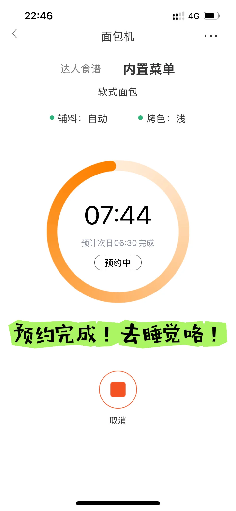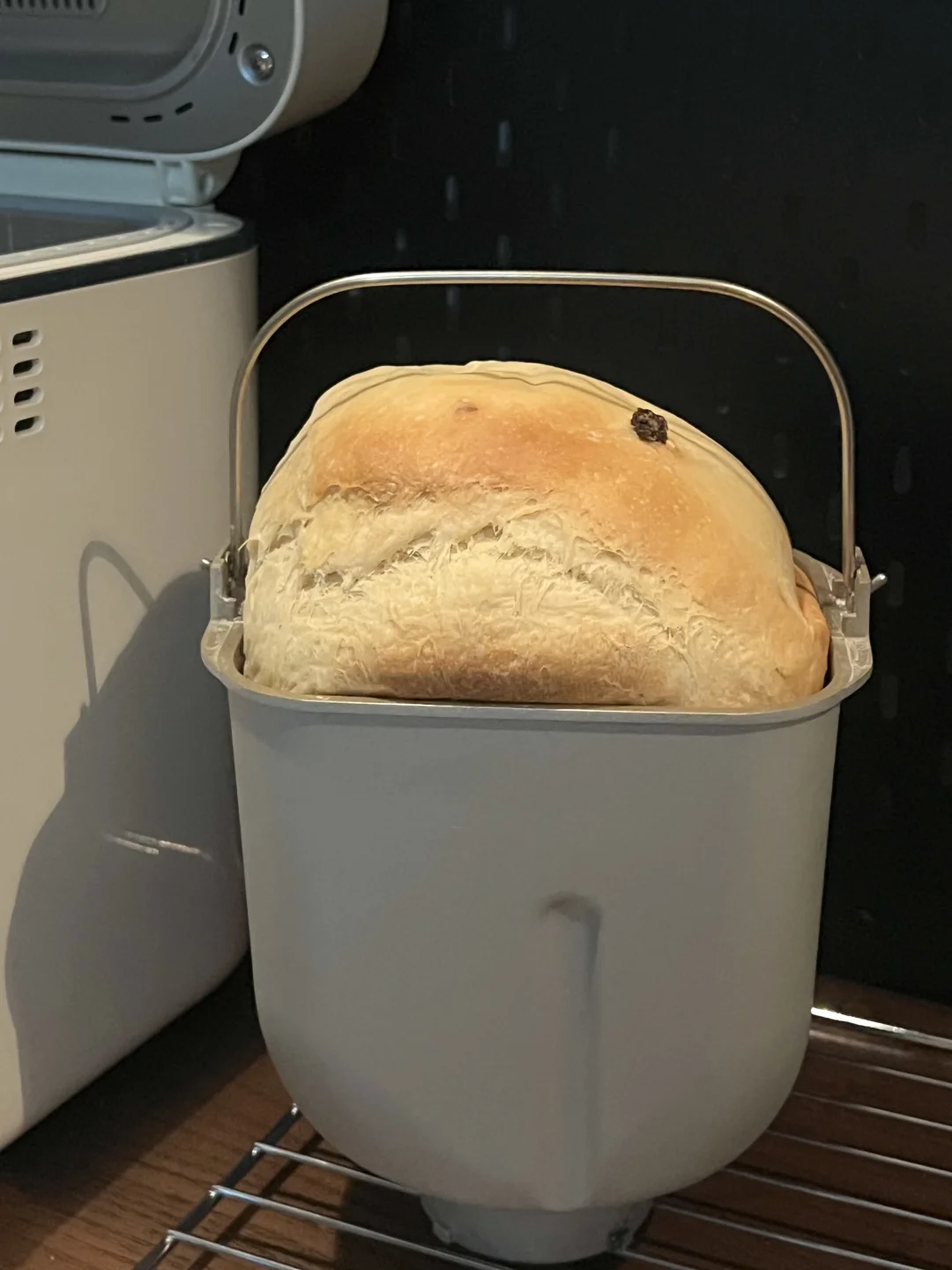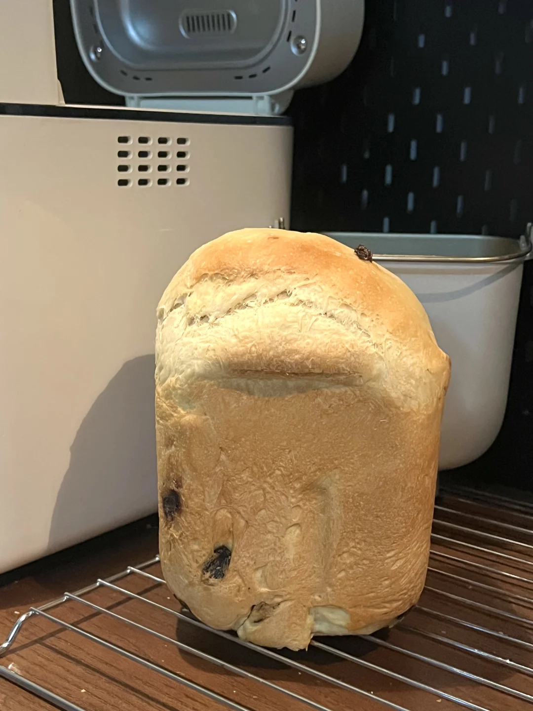 面包机食谱 躺在被窝里闻到了面包的香气是一种什么感觉? 是幸福呀! 听到滴滴的声音,迫不及待的跑出卧室 又是一个完美大爆头👏👏 📝室温21度 食材: 高筋面粉 260g 奶粉10g 冰鸡蛋1个 冰牛奶150g 红糖25g(白砂糖也可 盐3g 黄油 25g 耐高糖酵母 3g 葡萄干60g 过程: 1️⃣晚上18:00: 除黄油、酵母、葡萄干以外的其他材料放入面包桶,揉面15分钟,取出盖保鲜膜放冰箱冷藏(能拉出厚膜) 2️⃣睡前23:00: 把黄油放入面包机,酵母放酵母盒,葡萄干放辅料盒,选择程序8软式面包模式,预约到第二天早上你需要的时间,睡觉去咯~~