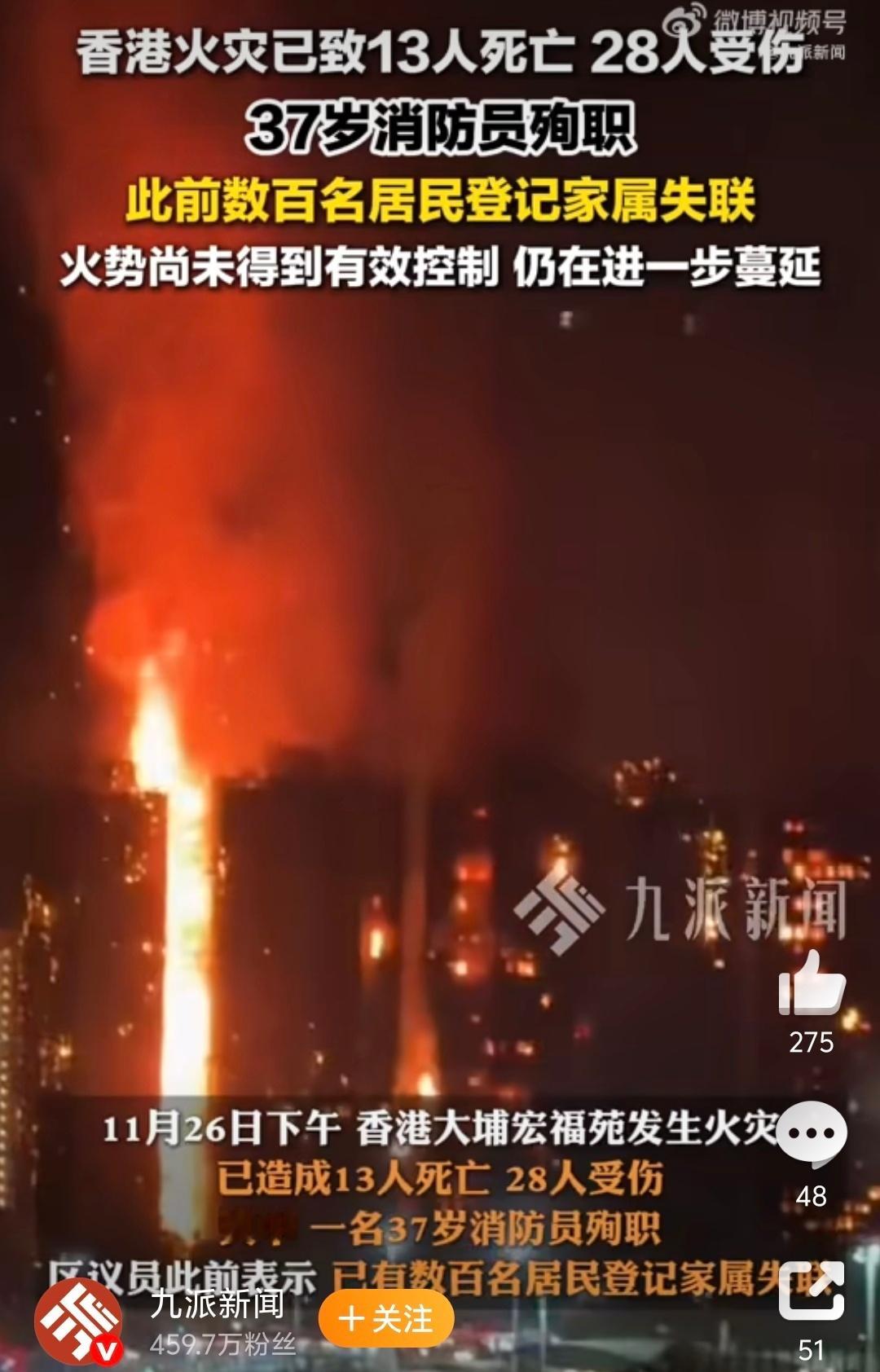 香港火灾附近住户发声 火灾太突然了,据说是竹子搭的脚手架引燃,已造成13人死亡,其中一名消防员殉职 香港火灾已致13死28伤 希望不要再有数字更新了,大家都要平平安安的