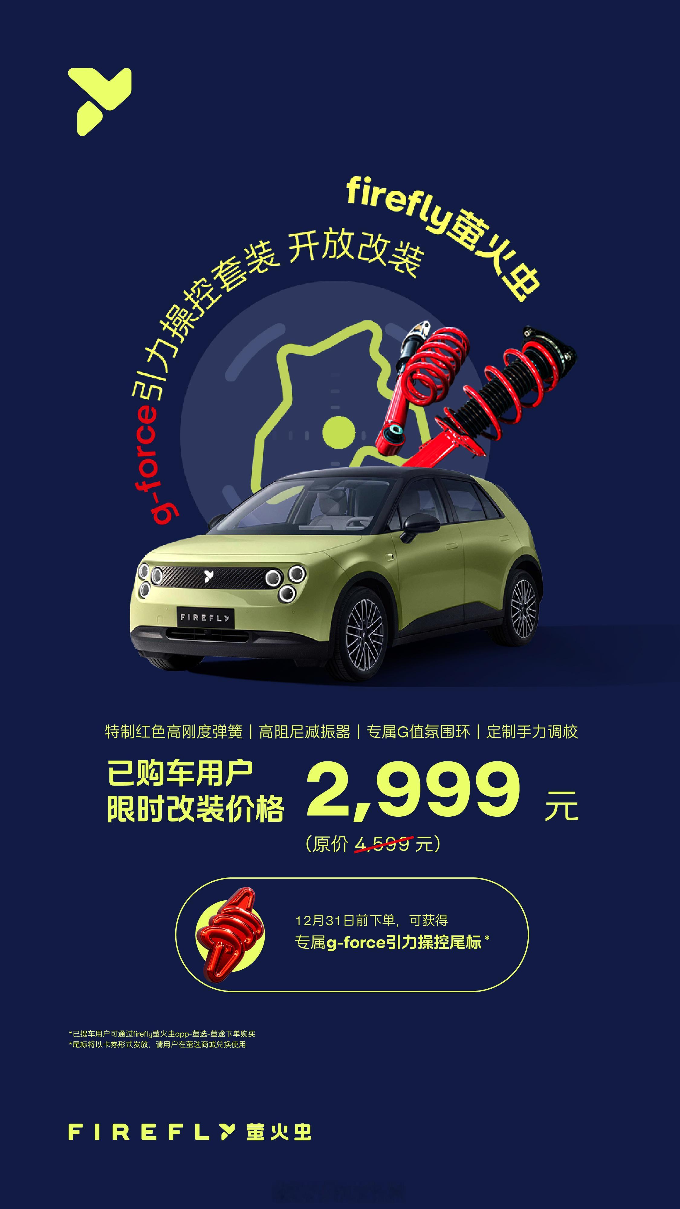 firefly萤火虫正式向所有用户开放g-force引力操控套装选配!11月22日起,新用户3,999元可选装、已购车用户4,599元可改装!12月31日前,新老用户均可享受2,999元限时优惠价格,还有g-force引力操控尾标专属标识!自在发光的firefly萤火虫在等你噢