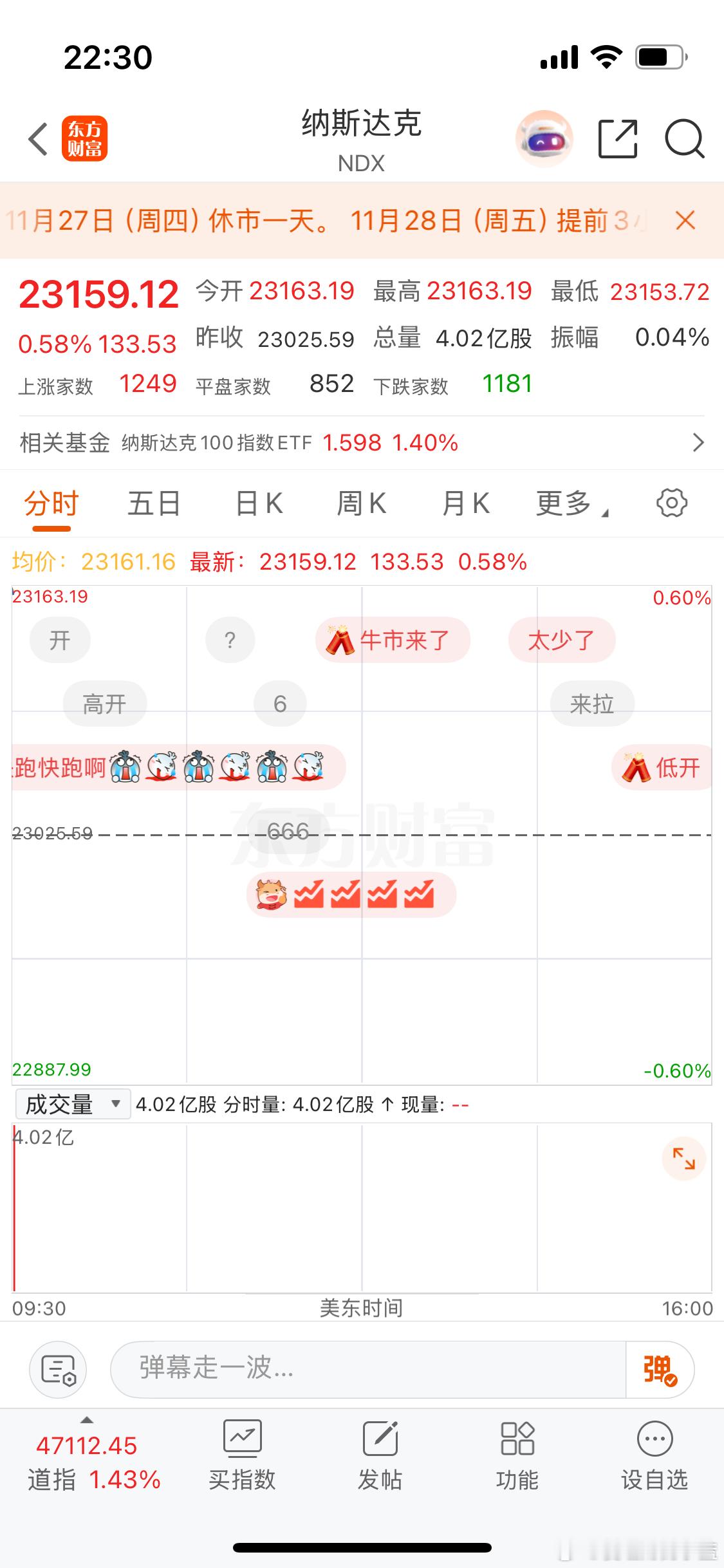 美股纳斯达克又高开。明天美国感恩节休市后天只开盘三小时。