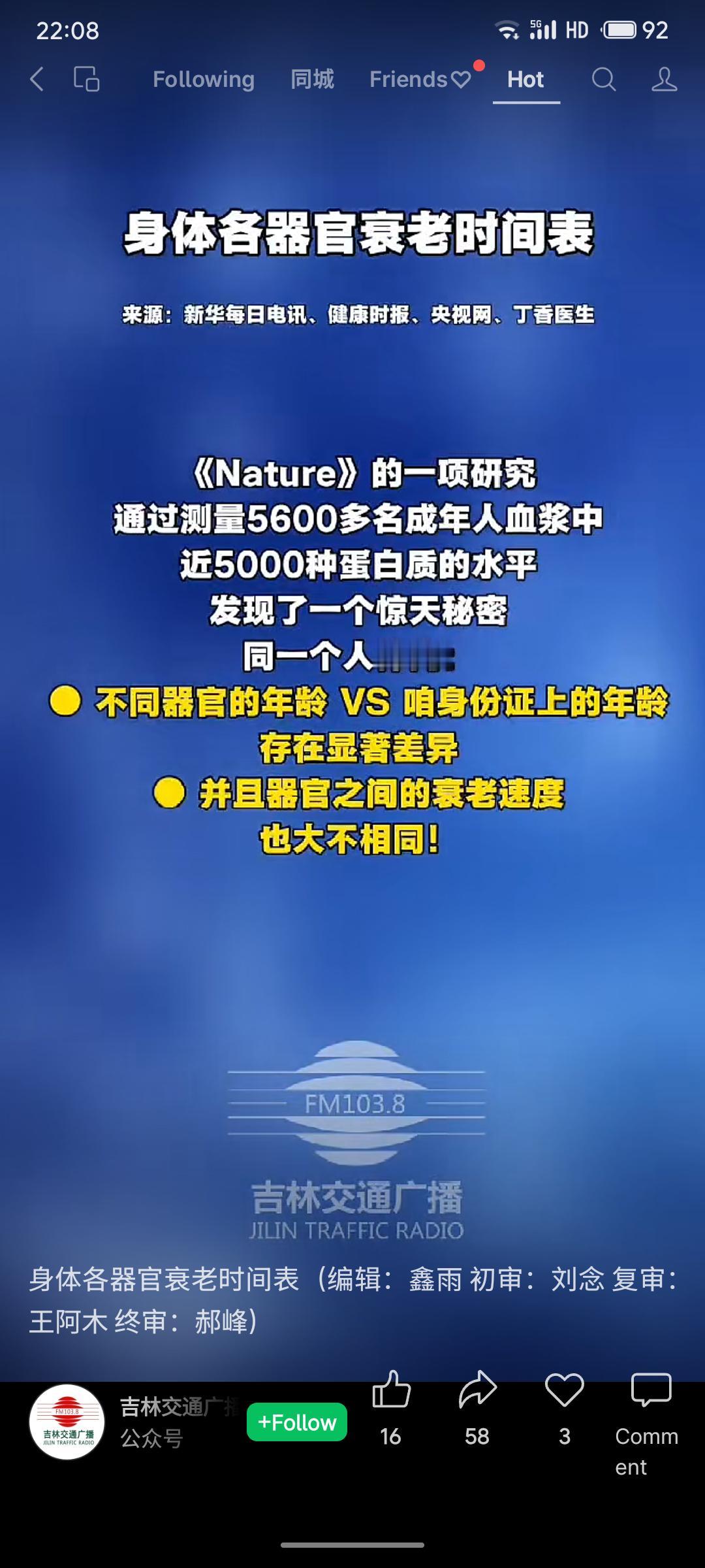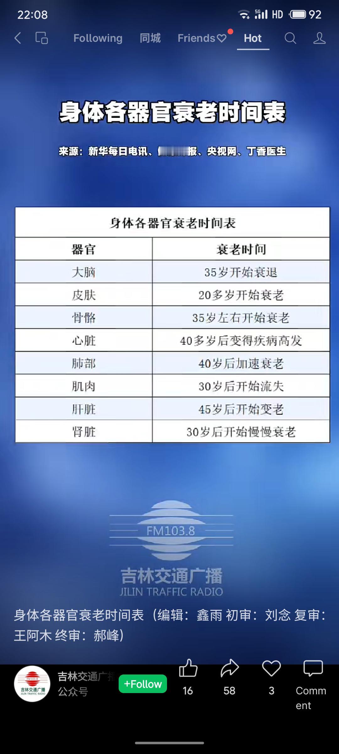 人体器官衰老并不同步,且普遍早于传统认知。例如皮肤从20多岁、大脑和骨骼从35岁左右便开始衰老,心脏、肺部则在40岁后加速衰退。研究表明,器官的生物学年龄与实际年龄存在差异。