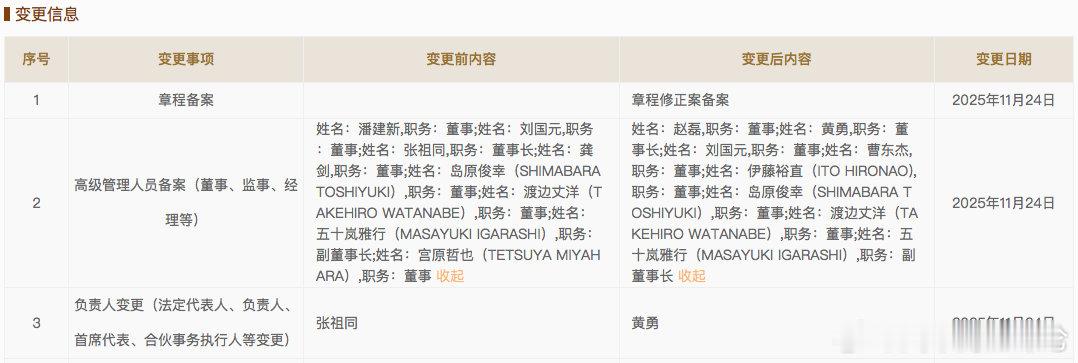 东风 据国家企业信用信息公示系统显示,11月24日,东风本田汽车有限公司(下称“东风本田”)发生工商变更,张祖同卸任法定代表人、董事长,由黄勇接任该职务。与此同时,该公司多位高级管理人员也发生人事变更。