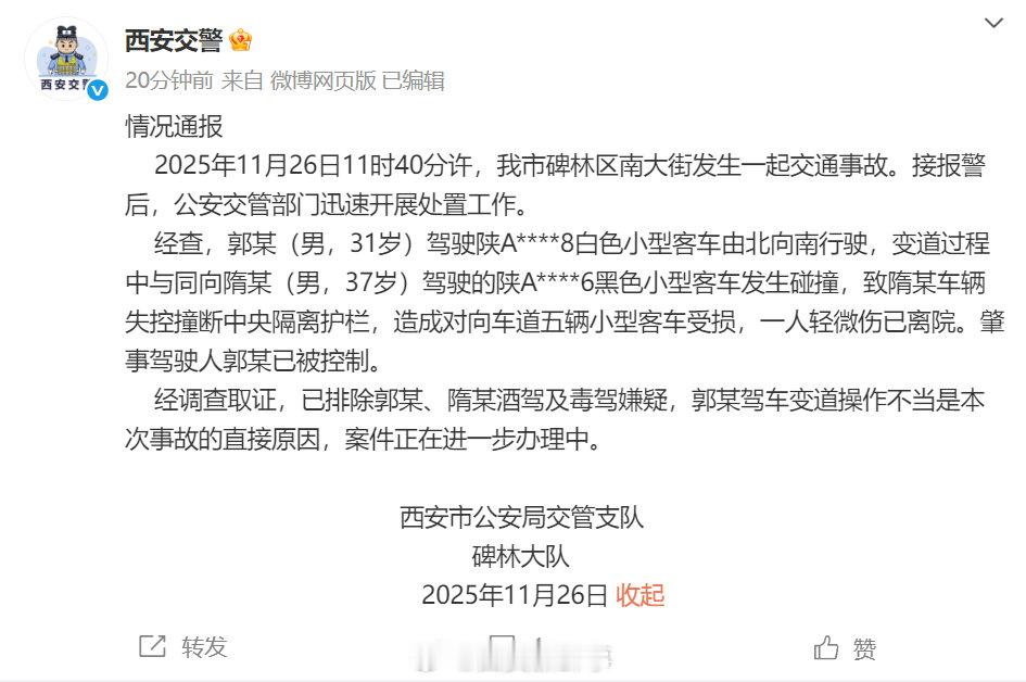 【西安交警通报多车相撞】男子驾车变道操作不当致多车相撞11月26日,就碑林区南大街交通事故发布情况通报:2025年11月26日11时40分许,我市碑林区南大街发生一起交通事故。接报警后,公安交管部门迅速开展处置工作。经查,郭某(男,31岁)驾驶陕A****8白色小型客车由北向南行驶,变道过程中与同向隋某(男,37岁)驾驶的陕A****6黑色小型客车发生碰撞,致隋某车辆失控撞断中央隔离护栏,造成对向车道五辆小型客车受损,一人轻微伤已离院。肇事驾驶人郭某已被控制。经调查取证,已排除郭某、隋某酒驾及毒驾嫌疑,郭某驾车变道操作不当是本次事故的直接原因,案件正在进一步办理中。