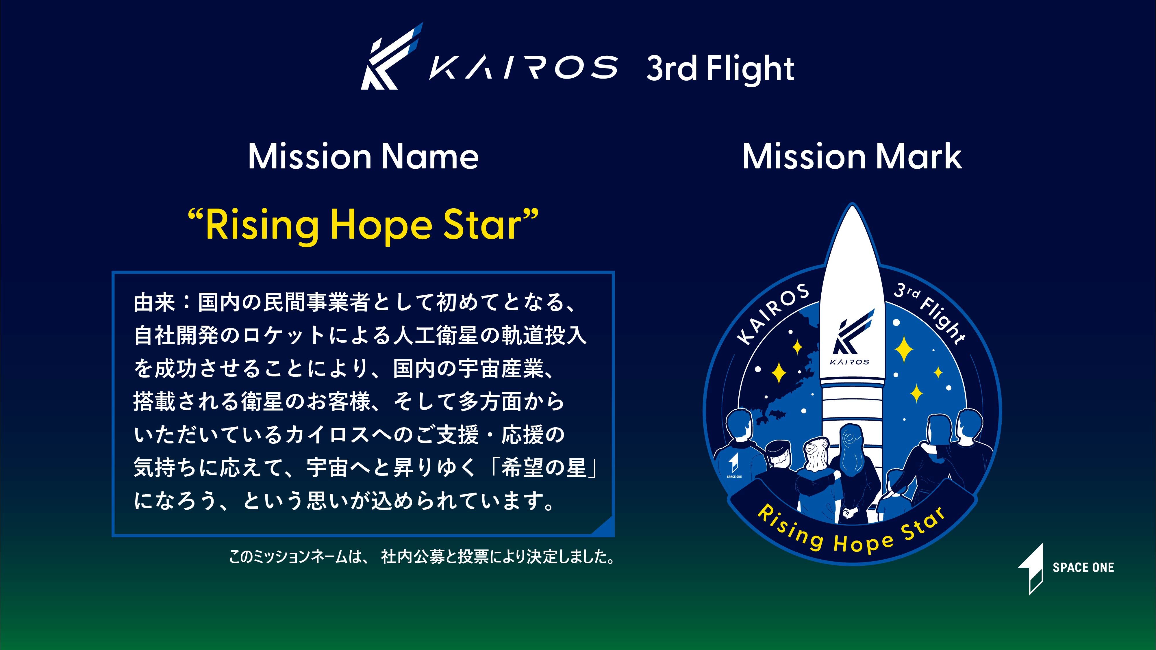 【SPACE ONE公布Kairos火箭3号机任务名称与标识】2025年11月25日,日本商业航天企业SPACE ONE宣布,为其正在筹备发射的Kairos火箭3号机确定了任务名称“Rising Hope Star”及相应任务标识。该任务名称经公司内部征集与全员投票表决产生,旨在承载双重期望:一方面,空间一号公司致力于成为日本首家成功以自研运载火箭将人造卫星送入预定轨道的民营航天企业;另一方面,借此回应日本航天产业界、卫星搭载客户及社会各界对Kairos火箭项目的长期支持与期待,寓意本任务将成为升向宇宙的“希望之星”。任务标识以“Rising Hope Star”为核心设计元素,视觉呈现紧扣该主题。具体图案虽未在公告中详细描述,但其创作理念与任务名称形成直接呼应。关于发射窗口,SPACE ONE表示将择期另行公布。