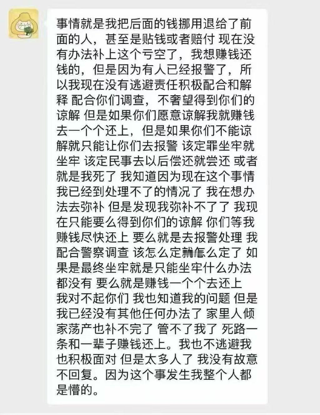 站姐涅槃 400万很无语 本人被骗了5500 希望大家引以为戒❗️❗️(不要轻信任何人)目前被骗人数500人以上(单人最多30w+) 涉及总金额400w以上💰前某大站站姐 当粉牛 出售各种票 包括但不限于演唱会 外务 首映 群演等……pyq及各种社交平台营造富二代人设,更有知名狗粉为其发博声称人家真的有钱。前期也真的出过首映 外务等门票 声称自己有内部人脉且消息灵通,获得了特别多人的信任,所以后期转账人数激增,导致目前涉案金额巨大。今日在朋友圈声称资金链断裂,无法还款,彻底爆雷。时至今日才知道她之前放出的言论皆为假,连朋友都被她骗去借高/利/dai。她基本没有什么渠道,因为需要资金追星追私,所以以这种渠道疯狂敛财满足私人欲望,再从黄牛手里收票来博取大家信任,让大量粉丝提前购买转钱!!!希望大家日后购买各类门票,擦亮眼睛!