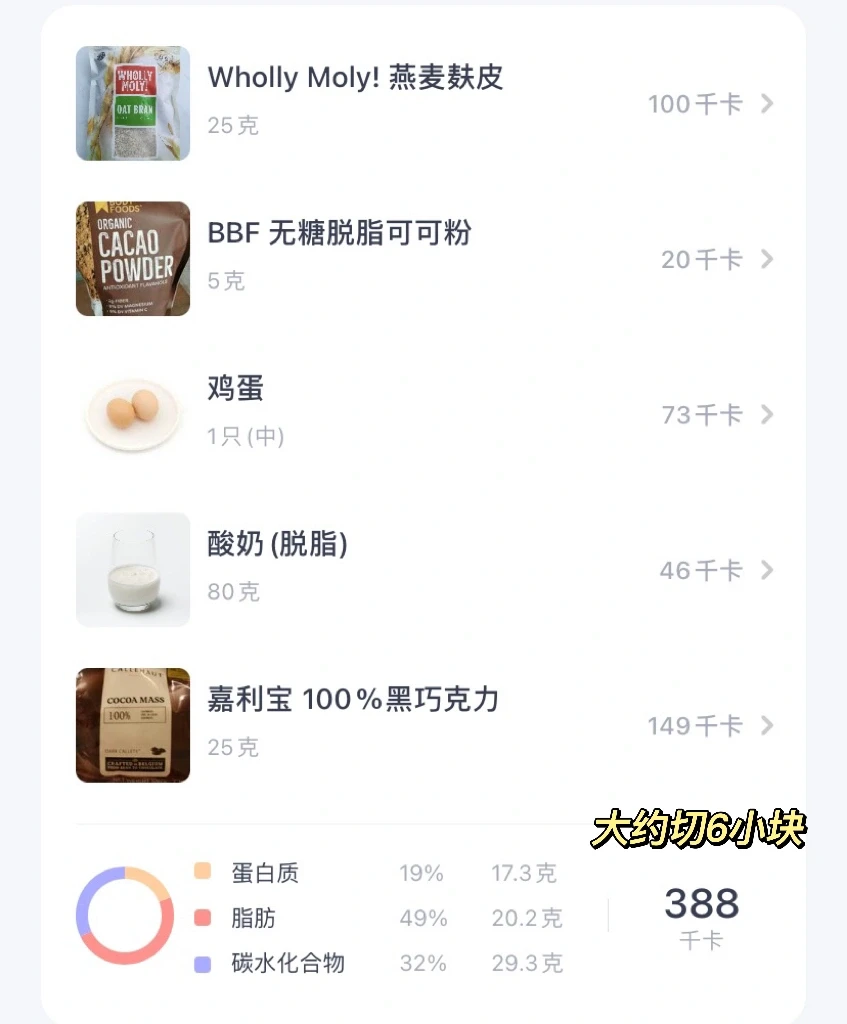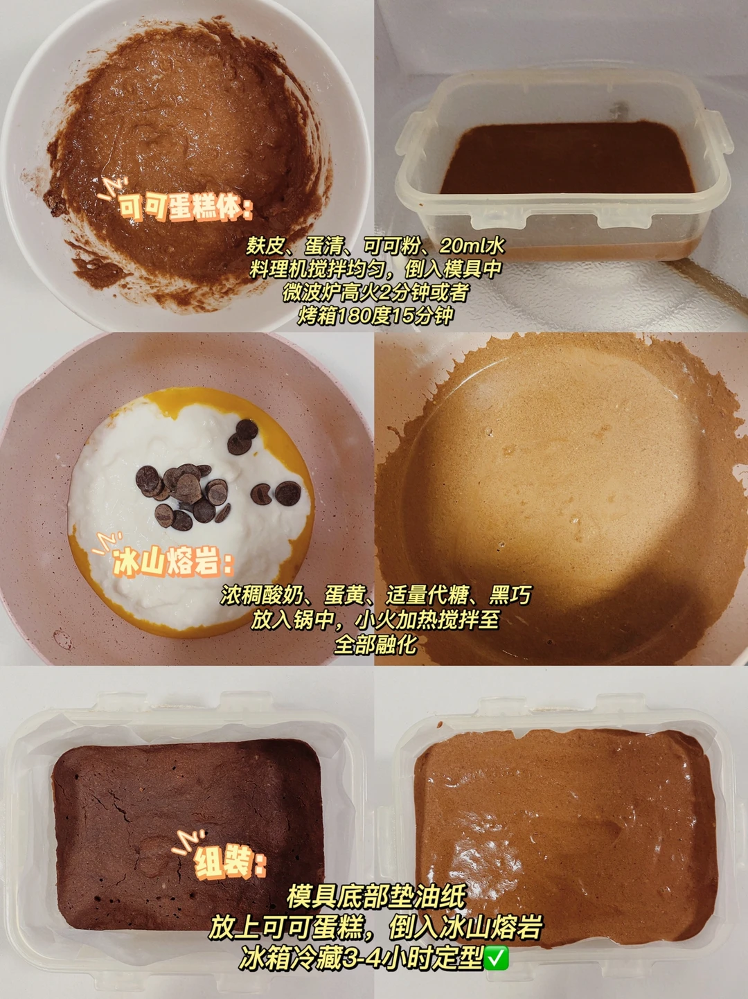 👩‍🍳巧克力蛋糕➕冰山熔岩,这个组合🔒死‼️无油无面粉,家庭低卡版,🐴住‼️ 💕64卡/块|食材简单|微波炉/烤箱都🉑️ 🌈减脂、健身、巧克力控、布朗尼蛋糕脑袋整起来‼️ . 🍃食材(388卡-400ml方形盒👉附热量表): 好哩燕麦麸皮25g(🉑️换杏仁粉、椰子粉等) 可可粉5g|鸡蛋1个 浓稠酸奶80g 100%黑巧25g 🌈代糖的量自己✋;喜颗粒感用麸皮,喜细腻口感磨成粉,想热量更低用燕麦纤维;怕苦黑巧用70%-80%;想要更松软,蛋糕体部分加1g泡打粉 . 📖简单步骤一看就会,直接翻图7⃣️ 🌈蛋糕体配上熔岩巧克力,真的绝绝子‼️ . 食材简单,美味不简单‼️ y1s1,口感不输好利来,自制的热量减半,黑巧➕可可粉做的冰山熔岩,提高代谢还能放暴食,嘴馋时吃一两块,就一点也不想再吃别的‼️ ㊗️仙女们越吃越瘦‼️