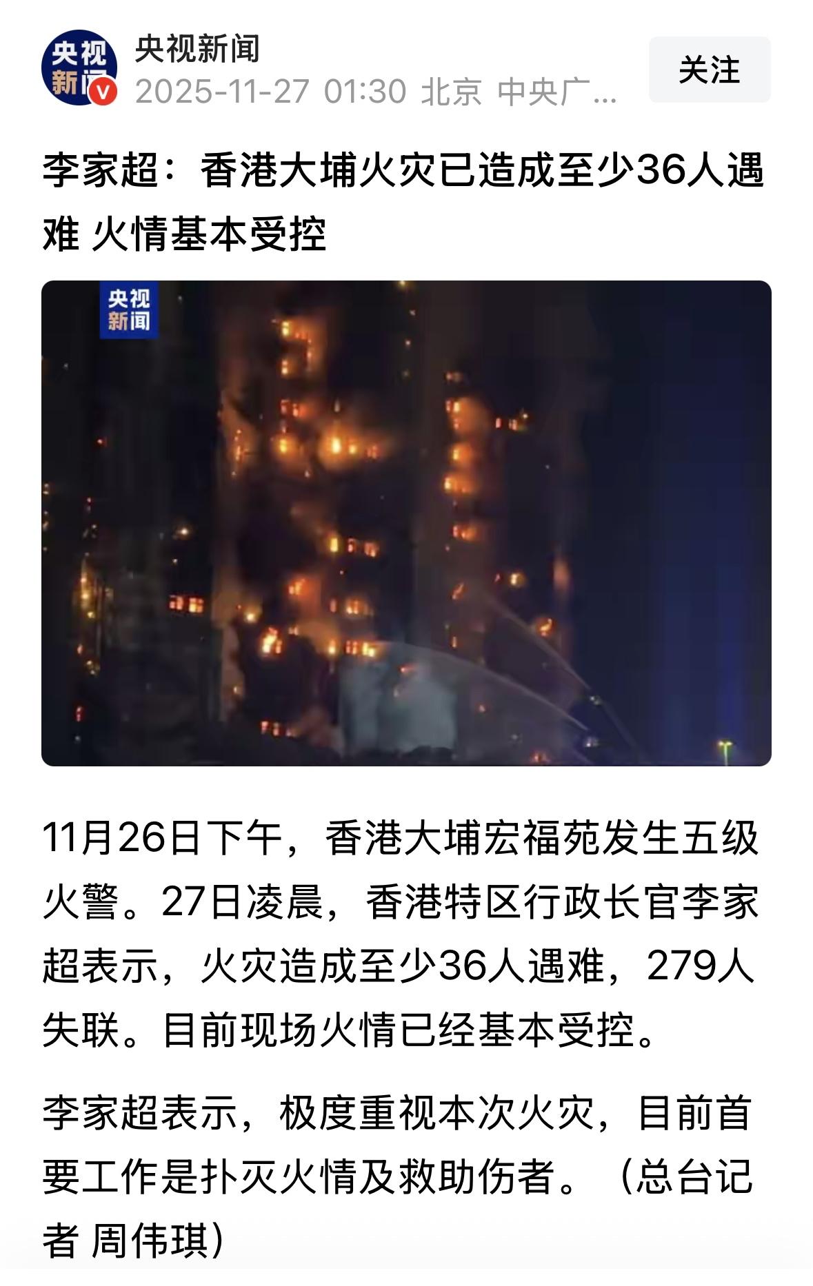 突来横祸,香港火灾造成至少36人遇难,279人失联。祈祷🙏祈祷🙏祈祷🙏[流