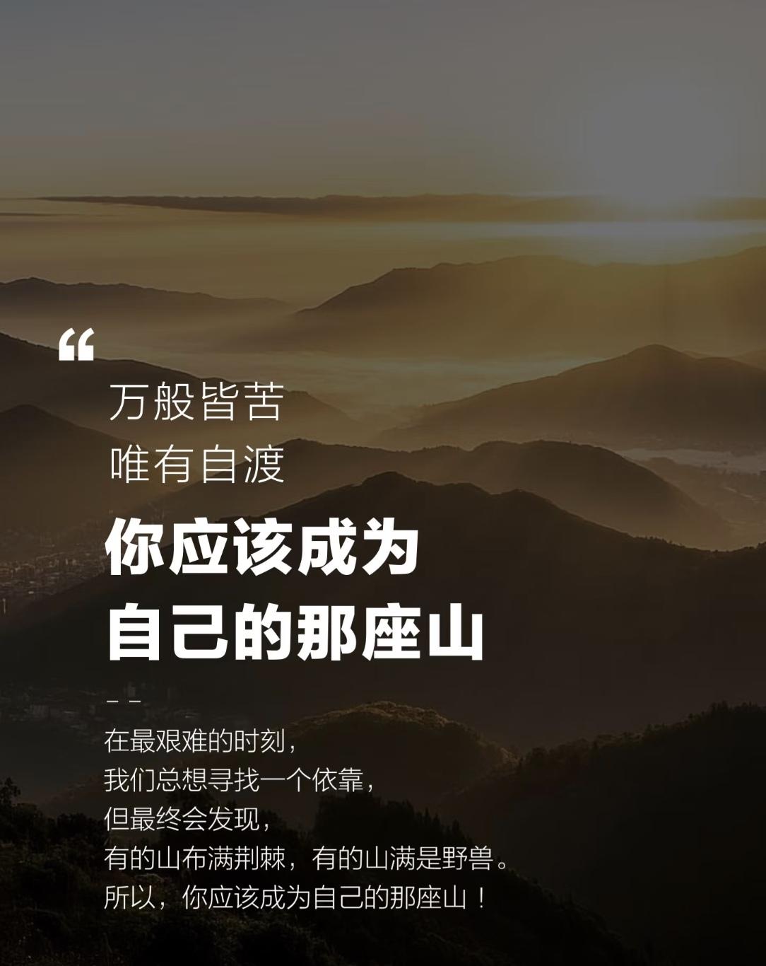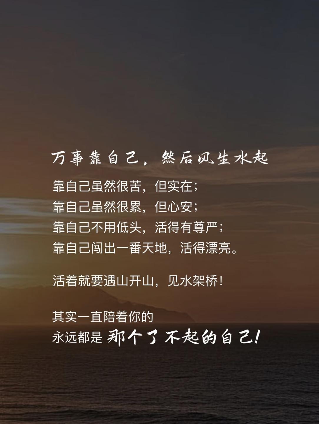 从空间上来说,自己是最重要的; 从时间上来说,现在是最重要的。 所以一个人要在认清自己的前提下充分相信自己。 人的一生要经历大大小小无数的磨难,真正让你走下去的只有三个字:靠自己! 毕竟亲朋好友的嘘寒问暖、倾囊相助最多解你一时之危,而面临各种人生难题之时,只有勇敢的自己逢山开路,遇水架桥才能走出一条康庄大道。 就如《道德经》所说:知人者智,自知者明,胜人者有力,自胜者强。 ------------------------------------ 点个赞+小评一下,愿人生的旅途从容洒脱,不慌不忙; 关注我+收藏一下,愿岁月的长河浅笑安然,细水长流。 冬日生活打卡季 带定位晒今日生活