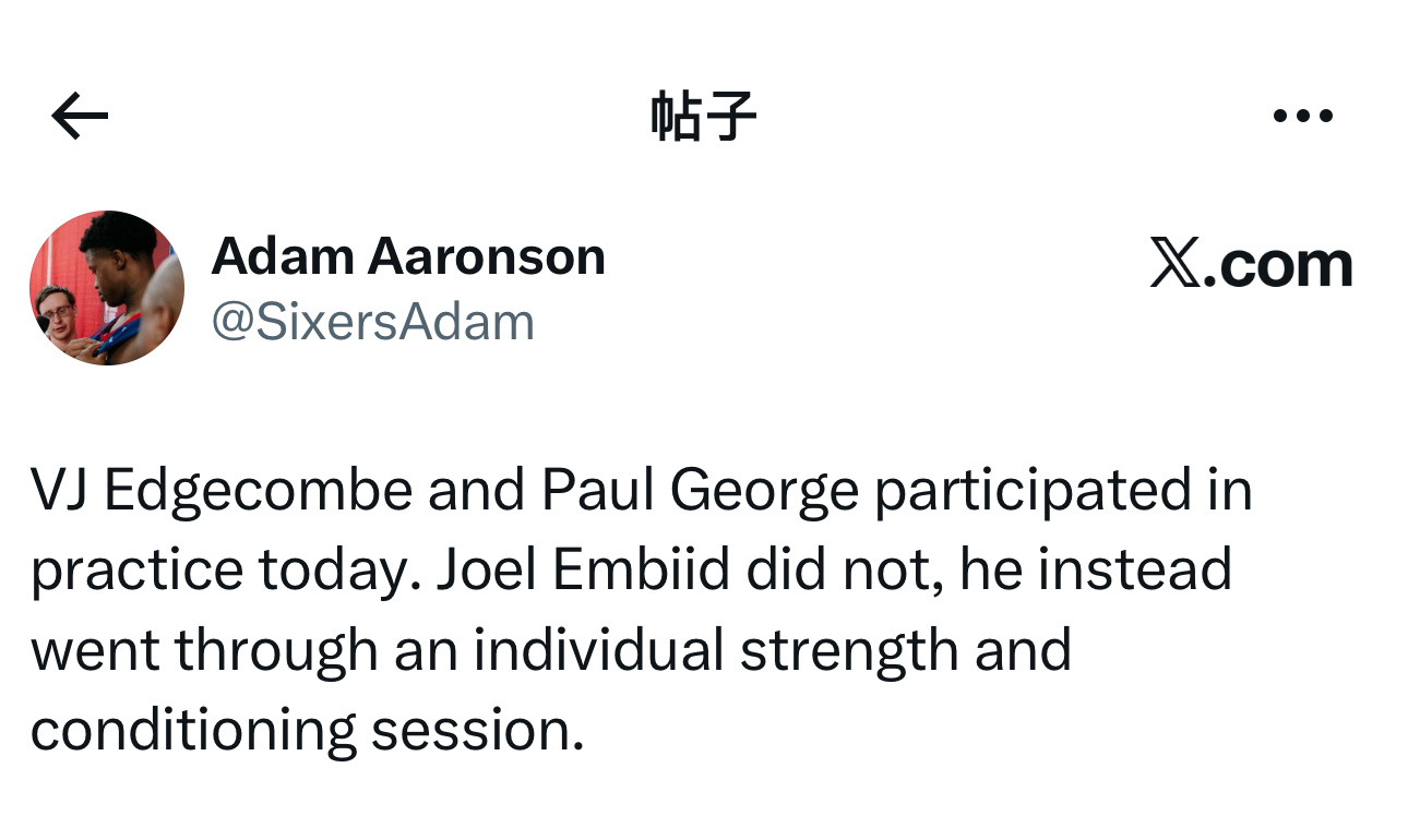 VJ·埃奇库姆和保罗·乔治今天参加了球队集训。乔尔·恩比德没有参加,而是进行了单独的体能训练。费城76人新赛季篮不住NBA常规赛