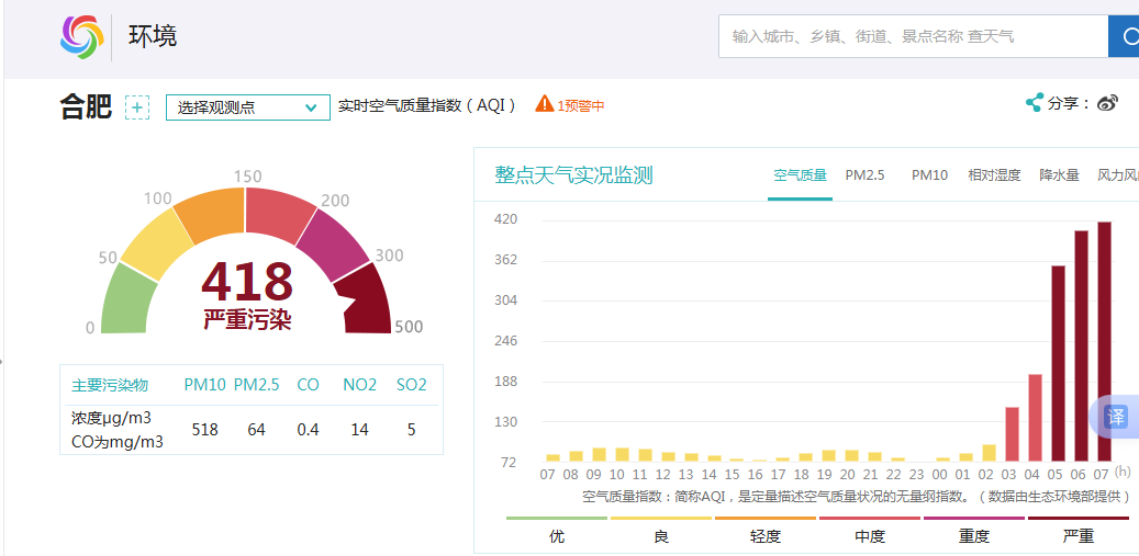【冷空气携沙南下 #合肥空气质量严重污染#】#冷空气正在过境安徽#,全省自北向南气温明显下降。此外,受上游输入影响,安徽多地空气质量出现明显下降,合肥市目前维持严重污染级别。27日早晨,安徽省气象台发布冷空气预报和全省天气预报: 目前一股冷空气正在影响安徽。受其影响,全省平均气温将下降3~5℃,同时西北风风力4级左右,阵风7~8级。冷空气过后,28日早晨大别山区和皖南山区最低气温降至-2~0℃,其他地区1~3℃。 今天白天到明天早晨:全省晴天。全省西北风4级左右,阵风7~8级转偏南风3级。27日早晨,有合肥市民感觉天空灰蒙蒙的。事实上,在这股西北风的影响下,从27日凌晨时分开始,安徽多地空气质量在明显转差。大皖新闻记者查询数据发现,27日凌晨2时合肥市AQI指数为98,空气质量仍维持在“良”;到了27日3时,合肥市AQI指数蹿升到了151,进入中度污染区间;4时,合肥市AQI指数达到了198,接近重度污染;到了5时,合肥市AQI指数蹿升到了355,进入严重污染区间;6时、7时,合肥市AQI指数为405、418,维持严重污染级别。11月27日6时,中央气象台继续发布沙尘暴蓝色预警:受冷空气大风影响,预计11月27日8时至28日8时,新疆南疆盆地西部、内蒙古西部、甘肃西北部、陕西北部、山西西南部、山东东部和南部、河南中东部、安徽、江苏、上海、浙江北部、湖北中东部等地的部分地区有扬沙或浮尘天气,其中,内蒙古西部、甘肃西北部局部有沙尘暴。(记者 赵明玉)