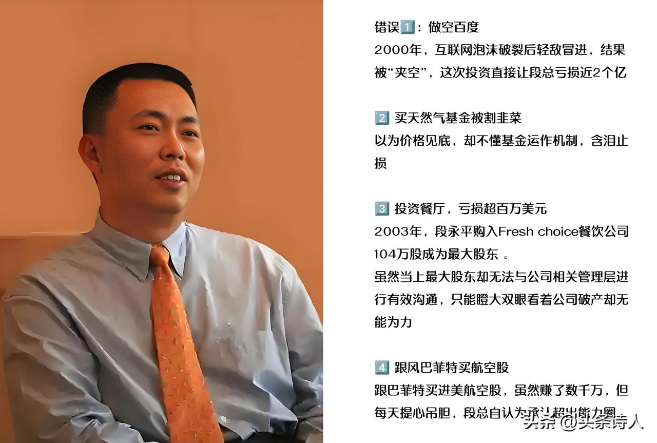 有人问段永平在投资上犯过什么错? 段永平这个号称“中国巴菲特”的神秘投资家 没想到也有过多次翻车案例→ 错误1⃣:做空百度 2000年,互联网泡沫破裂后轻敌冒进,结果被“夹空”,这次投资直接让段总亏损近2个亿 2️⃣ 买天然气基金被割韭菜 以为价格见底,却不懂基金运作机制,含泪止损 3️⃣ 投资餐厅,亏损超百万美元 2003年,段永平购入Fresh choice餐饮公司 104万股成为最大股东。 虽然当上最大股东却无法与公司相关管理层进行有效沟通,只能瞪大双眼看着公司破产却无能为力 4️⃣ 跟风巴菲特买航空股 跟巴菲特买进美航空股,虽然赚了数千万,但每天提心吊胆,段总自认为承认超出能力圈 💡 他最痛的不是亏钱,而是违背了这三条铁律: 🔹不做空 🔹不借钱 🔹不碰不懂的领域 这些错误让他明白:投资最大的风险,是你不知道自己正在冒险。 (信息来源:百度百科)