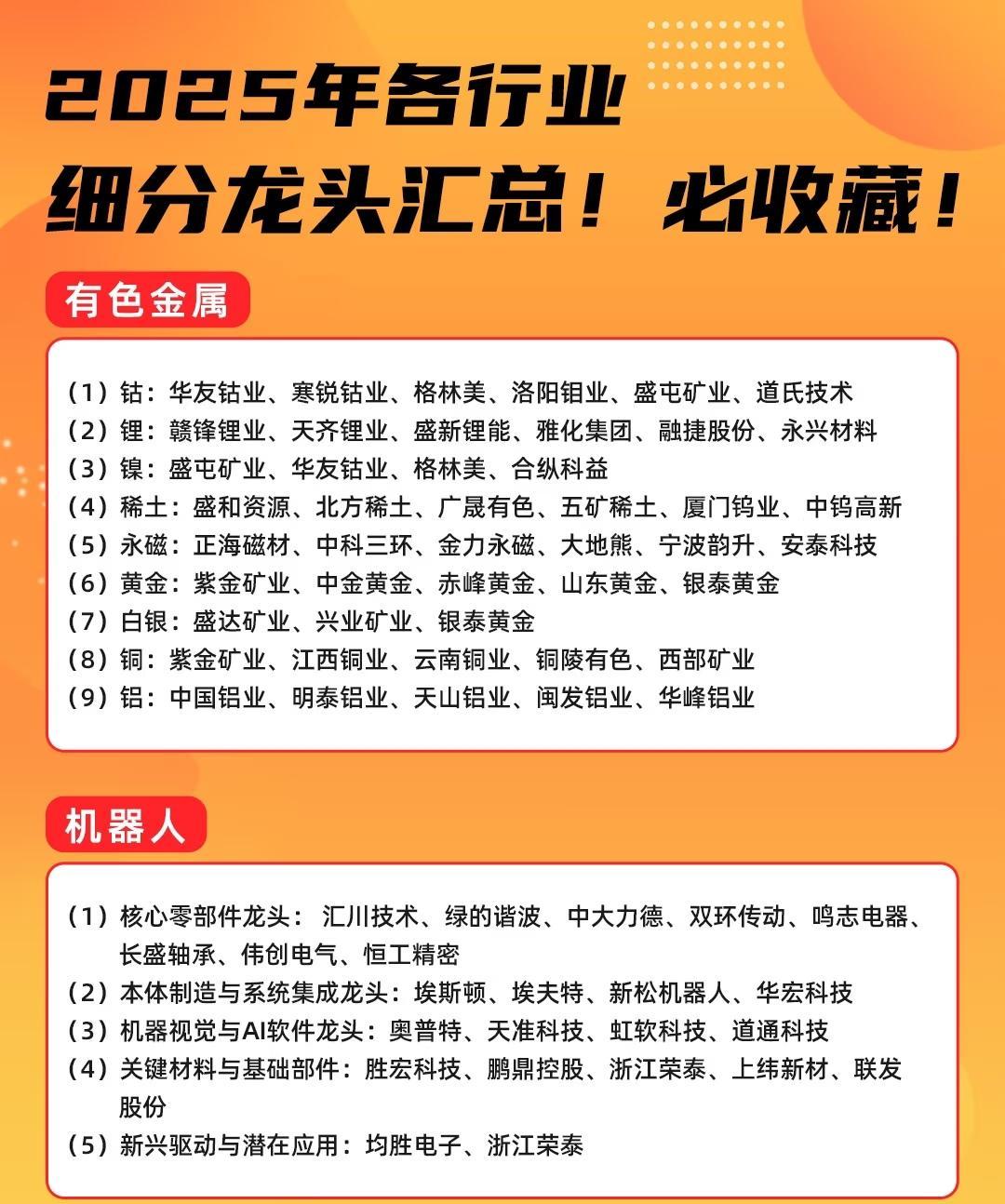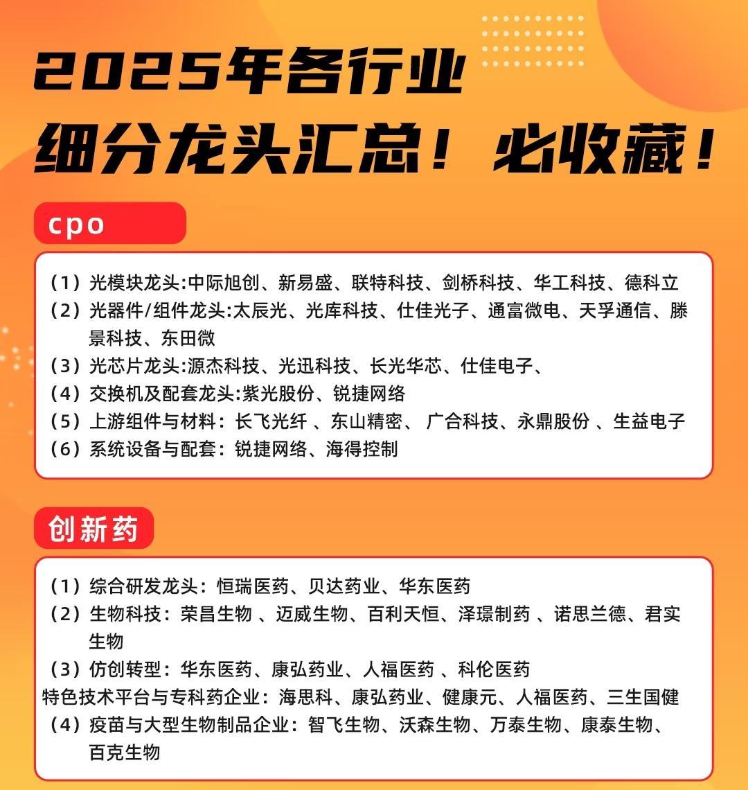 2025年各行业细分龙头汇总主要涵盖半导体、AI、有色金属、机器人、CPO、创新药等领域,具体如下:半导体分为制造、设备与材料、设计、封测四类龙头,制造龙头包括中芯国际、华虹公司等;设备与材料龙头有北方华创、中微公司等;设计龙头含兆易创新、韦尔股份等;封测龙头为长电科技、通富微电等。AI覆盖光模块、光芯片、国产AI芯片、AI服务器、交换机、液冷设备、数据中心、华为算力、算力租赁、存储、AI大模型、数据要素、AI应用、AI游戏、AI传媒、英伟达产业链等领域,例如光模块龙头为中际旭创、天孚通信等;国产AI芯片龙头有海光信息、寒武纪;AI服务器龙头包括中科曙光、浪潮信息等。有色金属涉及钴、锂、镍、稀土、永磁、黄金、白银、铜、铝等金属领域,钴龙头有华友钴业、寒锐钴业等;锂龙头包括赣锋锂业、天齐锂业等;稀土龙头含盛和资源、北方稀土等;黄金龙头有紫金矿业、中金黄金等。机器人分为核心零部件、本体制造与系统集成、机器视觉与AI软件、关键材料与基础部件、新兴驱动与潜在应用五类,核心零部件龙头如汇川技术、绿的谐波等;本体制造与系统集成龙头包括埃斯顿、埃夫特等;机器视觉与AI软件龙头有奥普特、天准科技等。CPO包含光模块、光器件/组件、光芯片、交换机及配套、上游组件与材料、系统设备与配套六类,光模块龙头为中际旭创、新易盛等;光器件/组件龙头有太辰光、光库科技等;光芯片龙头含源杰科技、光迅科技等。创新药分为综合研发、生物科技、仿创转型、特色技术平台与专科药企业、疫苗与大型生物制品企业四类,综合研发龙头如恒瑞医药、贝达药业等;生物科技龙头包括荣昌生物、迈威生物等;疫苗与大型生物制品企业龙头有智飞生物、沃森生物等。
