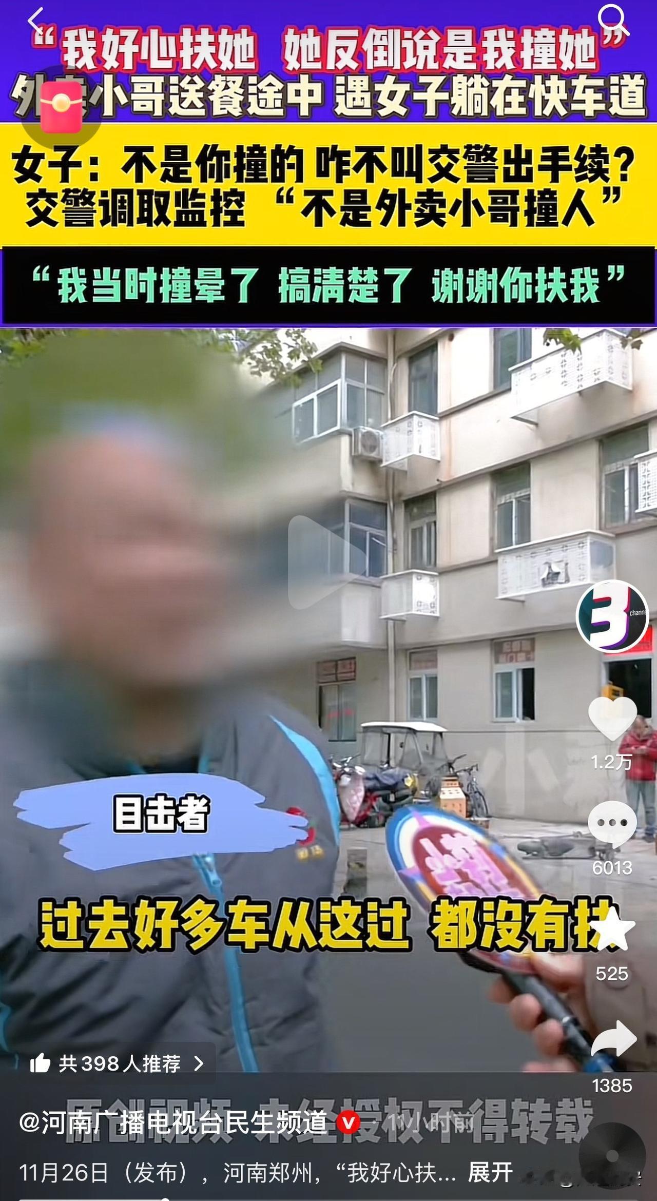 太寒心了!外卖小哥在送餐的途中遇一女子,满手是血的躺在快车道上,他好心帮忙扶起来,不料却被诬陷是撞人者。就连帽子叔叔称“不是小哥撞的人”,女子却反问“不是你撞的,你咋不叫交警出手续?” 近日,河南郑州,外卖小哥刘阳在送餐的路上,看到一个满手是血的女子躺在路上,他想都没想就把女子扶起来。 谁料,女子不仅没有对他说声谢谢,直接诬陷是他撞的,还不让他离开。刘阳当时就懵了,没想到“扶人被讹”会发生在自己身上。 他问女子:“如果查出来,不是我撞的你,耽误我的损失,你会不会赔偿?”女子听完后只是把头扭在一边,默不作声。 随后她拨打了报警电话,当着帽子叔叔的面一口咬定是刘阳撞的他,这下小哥实惨,不仅后续的订单全部超时,而且车子还被没收了,直接损失1500左右。 刘阳觉得自己特别冤枉,他也明白了那句至理名言“不是你撞的,干嘛要去扶?”有理说不清的他,只能找记者帮忙,给自己讨一个公道。 记者拨打了当时处理事故的帽子叔叔,对方说,当时女孩意识都不清楚了,指认的就是刘阳撞人。 刘阳紧接着询问,是不是自己撞的人? 帽子叔叔肯定的回答,不是,女子妹妹也看完监控了,也跟她讲了,不是你撞的,事故认定书上不会有你的名字,只要你这个费用,最后有人给你承担不就可以了。 帽子叔叔的话也给刘阳吃了一颗定心丸,他跟随记者来到医院,直面跟女子对质。 女子以及她的妈妈仍然坚持认为是刘阳撞的,记者当着她们的面再次拨通了帽子叔叔电话,对方再次确定不是他撞的。女子情绪激动的质问刘阳,“不是你撞的,你咋不让交警给你出手续?” 帽子叔叔解释道,这种证明没法出,最后认定书上没写着外卖员的名字,就跟人家没关系。 随后记者询问女子,外卖员因为扶你,产生的损失谁来承担? 话没说完,女子母亲就生气的推搡着让他们出去,在她们母女二人看来,刘阳倒像是狮子大开口来讹人的。 经过一番拉扯后,女孩语气也缓了下来,说自己也是有头有脸的人,好面子,希望她和刘阳能坐下来单独沟通。 事后帽子叔叔再次肯定了,刘阳是好人做好事,他的损失肯定会有人承担,会把肇事方,女孩,刘阳约到一起,共同商量解决这件事。 经过帽子叔叔的不懈努力,很快找到了肇事人,也找到了目击者,据目击者称,当时好多车从她身边过去,只有小伙子去扶了,他是办好事了。 最后事情真相大白,女子也意识到自己的错误,特意给小哥送了锦旗,并支付了赔偿。 此事传到网上也引起轩然大波。 有网友称,多亏有监控才找到第三方,如果没有监控,小哥是跳进黄河也洗不清。 也有网友表示,现在不敢扶的风气,不都是女子这样的人给弄的吗? 我们一直在“扶不扶”的问题上纠结,就是怕“扶人反被讹”发生在自己身上,如果没有监控,没有目击证人,不敢想象小哥的“结局” 是什么。 所以我们在遇到要帮助的时候还是要尽可能地寻找目击证人,或者是在公众场合有监控的情况下,伸出援手,也或者救人之前拿出手机录下视频。 虽然不知对方是否是存在恶意,但一定要给自己留一个后路,也希望社会可以少一点这样的“恶人”,让善良的人不再心寒,让做好事成为一种自然而然的行为,而不是需要畏手畏脚的自证清白!