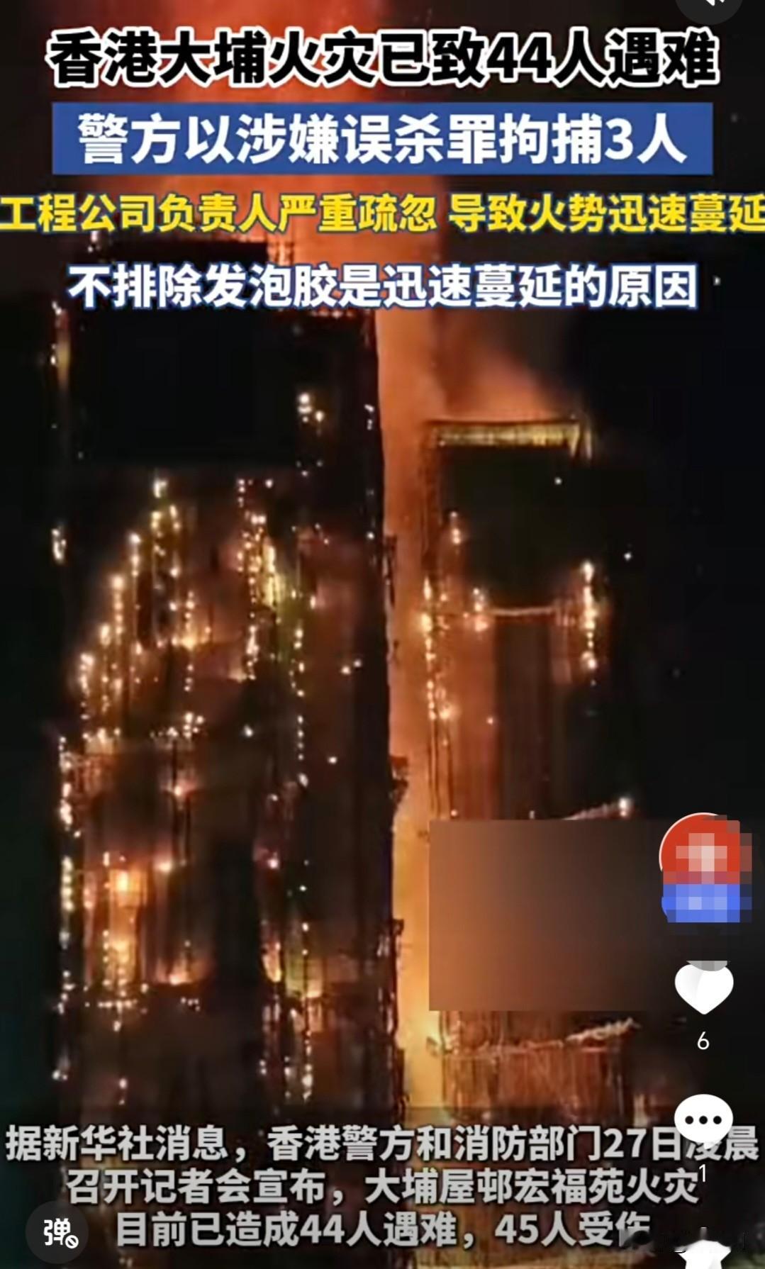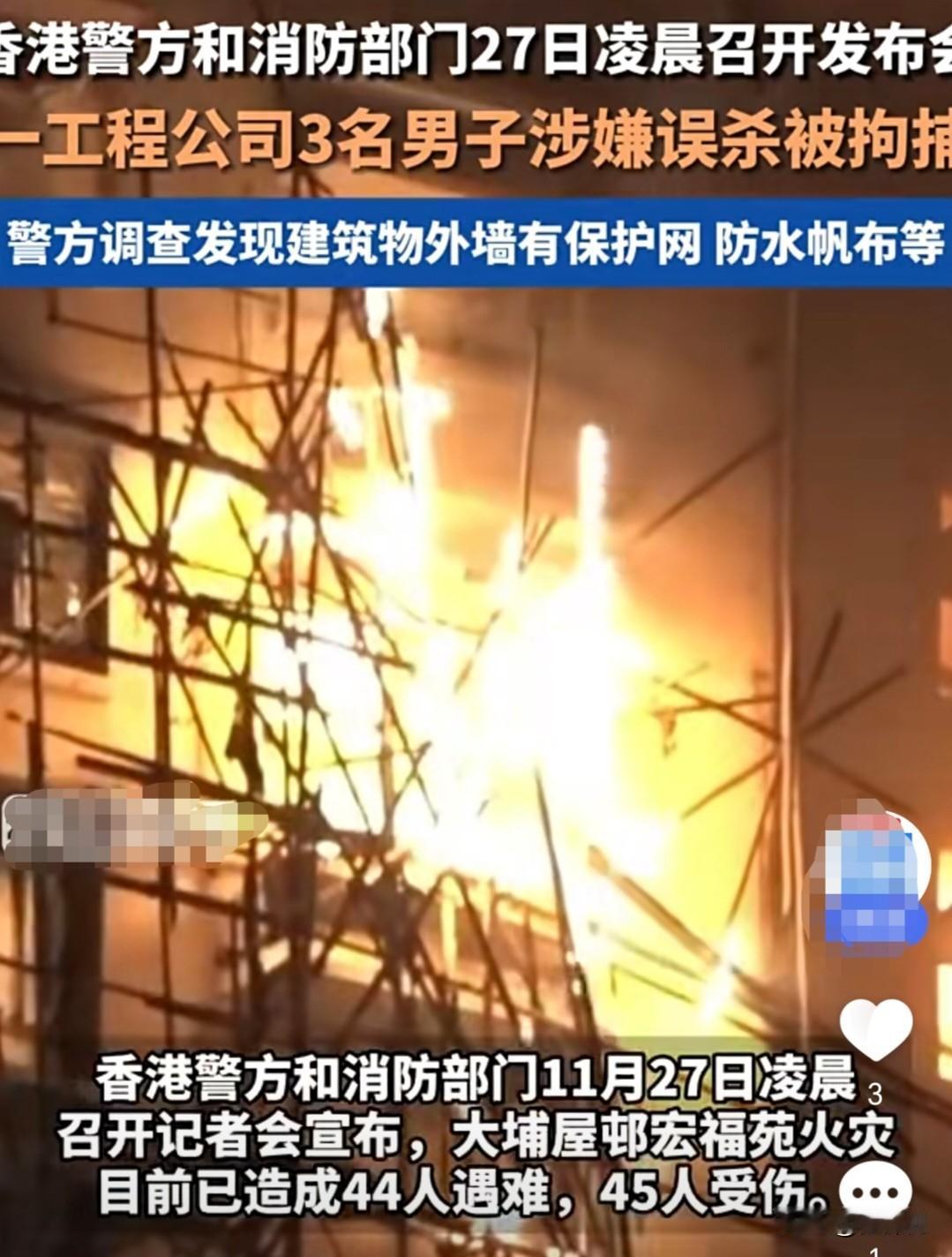 44人遇难,279人失联!香港大埔火灾原因浮出水面。 截至27日凌晨,香港大埔屋邨宏福苑火灾已造成44人遇难,45人受伤,279人失联,警方已拘捕3名涉嫌误杀的男子。 目前火警等级已经升为5级,火灾蔓延了该小区8栋住宅楼中的7栋。 ​11月26日2点51分,香港大埔宏福苑小区发生火灾,起初只是10楼外墙棚架起火。消防员立刻赶往现场灭火,但火势蔓延极快,现场的消防员人力有限,无法扑灭。 下午3时02分火情升为三级,下午3时34分再升为四级,晚上6时22分升为五级(一共就6个等级),这意味着火情极其严峻。 我们来分析一下火势蔓延如此迅速的原因: 首先:和这些大厦所用的建筑材料有关 (一)​着火的脚手架是竹子做成的,这种脚手架和钢结构相比轻便、价格低,早期的香港建筑很多都采用这样的材料,但这种材料却存在安全隐患,它不如钢结构结实耐用,而且易燃。 着火的大厦外墙设置有保护网,但所用材料是帆布、塑料布,这些并不符合防火标准。 另外根据现场调查发现,没有起火的大厦,每层电梯大堂窗外都有发泡胶包封,这样的发泡胶易燃,如果起火的大厦采用的是同样的发泡胶包封,那么发泡胶可能是导致火势蔓延极快的原因之一。 ​ (二)老旧的建筑物,消防设施非常不完善。发生火灾的建筑物都是在20世纪80年代所建,不仅逼仄狭窄,而且消防设施配备不全。而且大厦有32层,高度较高,给扑灭火情造成了困难。 (三)天气原因:发生火灾时,正值大风天气,在大风的催化之下,火势蔓延非常快。 (四)人为因素:有从火灾现场逃出的居民表示,曾经看到维修工人在维修时抽烟,这极可能引发火灾。 香港保安局局长邓炳强表示,本次火灾不排除刑事案件的可能性。记者看到一名戴头套的嫌疑人被警方带走。 负责安装上述相关材料的工程公司负责人存在严重疏忽,警方已经拘捕了3人,其中包括2名董事、1名工程顾问。 目前宏福苑8座大厦中,7座着火的大厦有4座大厦的火势已经受到控制,剩下3座大厦的火势仍在努力控制中。 让人揪心的是,发生火灾的大厦住户约有8000到10000人,老年人居多。这些老人行动不便,发生火灾时出逃困难。 希望火情可以快速得到控制,希望不要再有人员伤亡。
