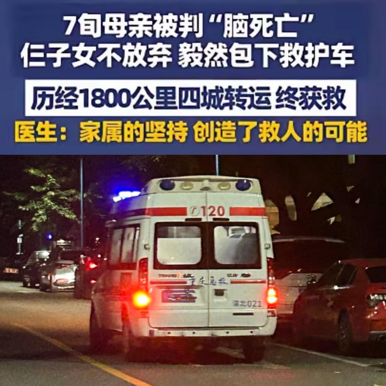 泪目!甘肃7旬母亲被判“脑死亡”,子女偏不信邪,花4万包救护车跨1800公里转四城,硬是从死神手里抢回妈! 这哪儿是简单的救治,分明是孝心撑起来的生命奇迹。当地医生下了病危通知,旁人都劝节哀,可三兄妹铁了心:只要妈还有一口气,就绝不放弃。 1800公里的奔波里,老人病情急转直下,到西安医院时已脑疝、瞳孔放大,全靠呼吸机续命。面对“希望渺茫”的坦诚,女儿带着哭腔却无比坚定:“求你再试试,我不能这样把妈妈拉回去!” 医生说行医三十年少见这般奇迹,其实哪是运气,是子女的坚持给了医生放手一搏的底气。重症抢救里,家属的不放弃从来都是最好的“特效药”,比设备和药物更能给生命续航。 父母养我们小拼尽全力,我们守他们老就该倾其所有。这份不放弃的孝心,才是世间最动人的力量。