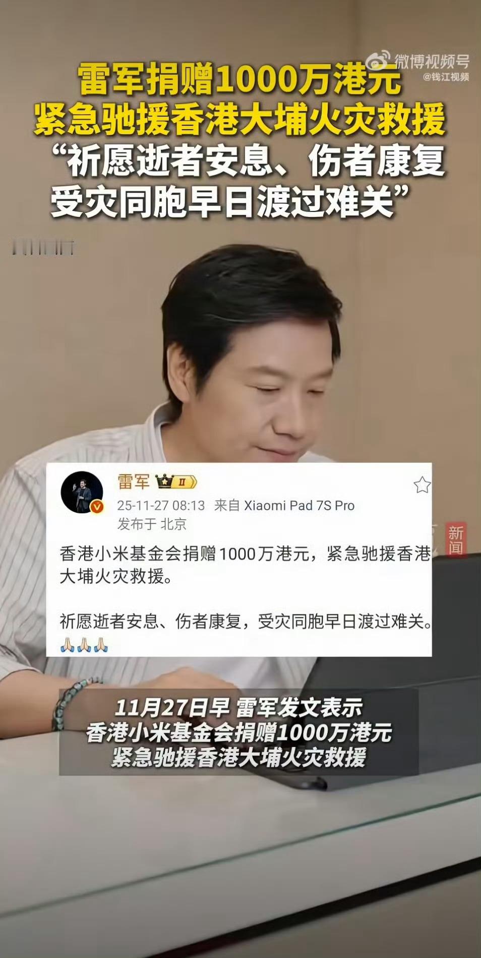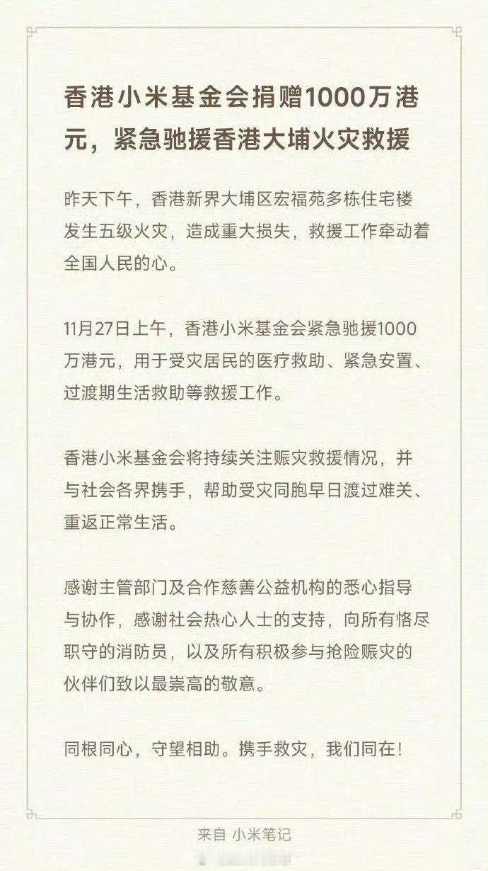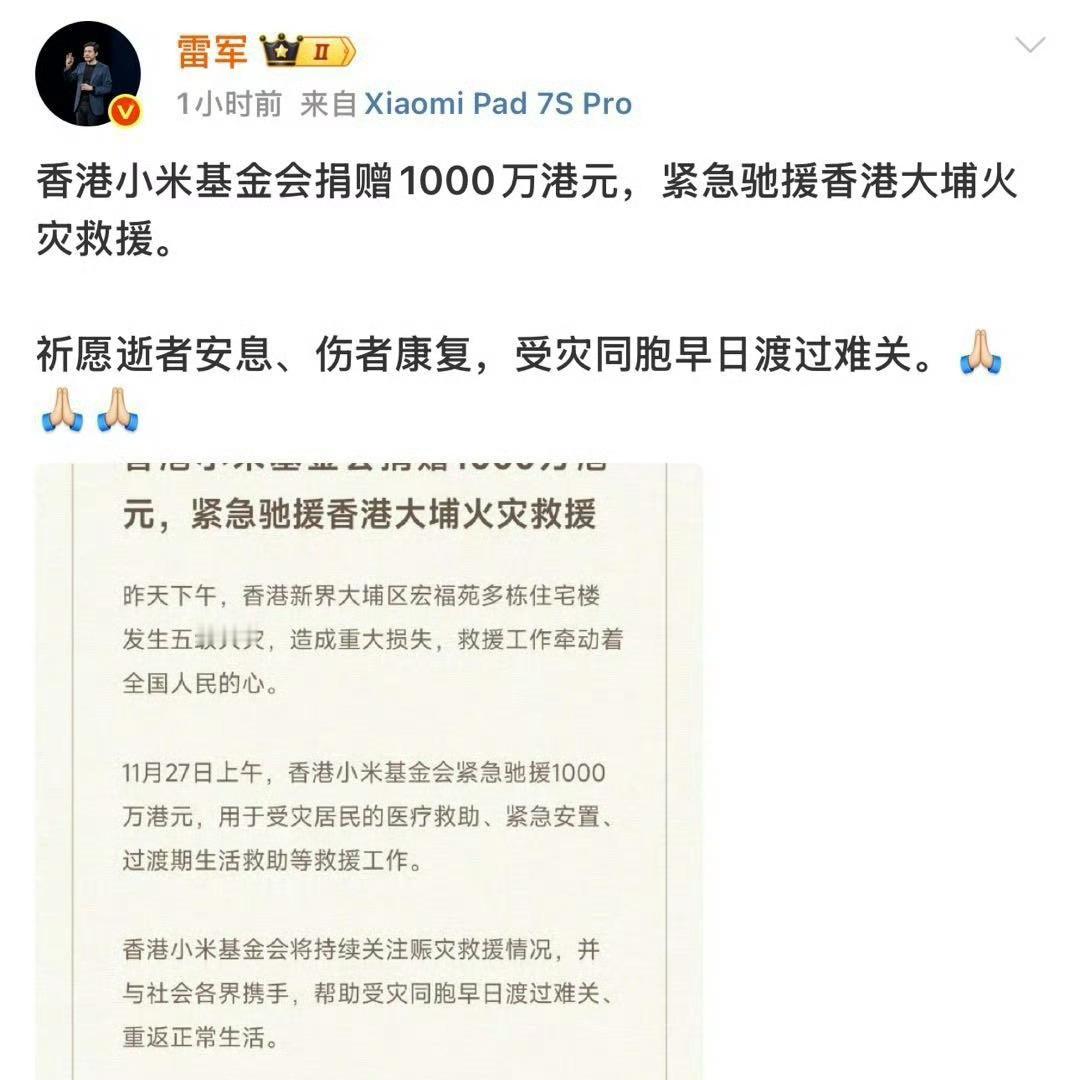 雷军回应小米基金会捐1000万港元同根同心,守望相助,点赞👍🏻👍🏻👍?