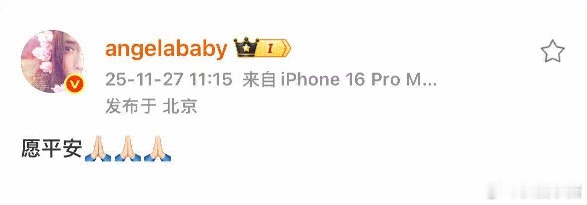 Angelababy发文为香港同胞祈福:“愿平安🙏🏻🙏🏻🙏🏻”