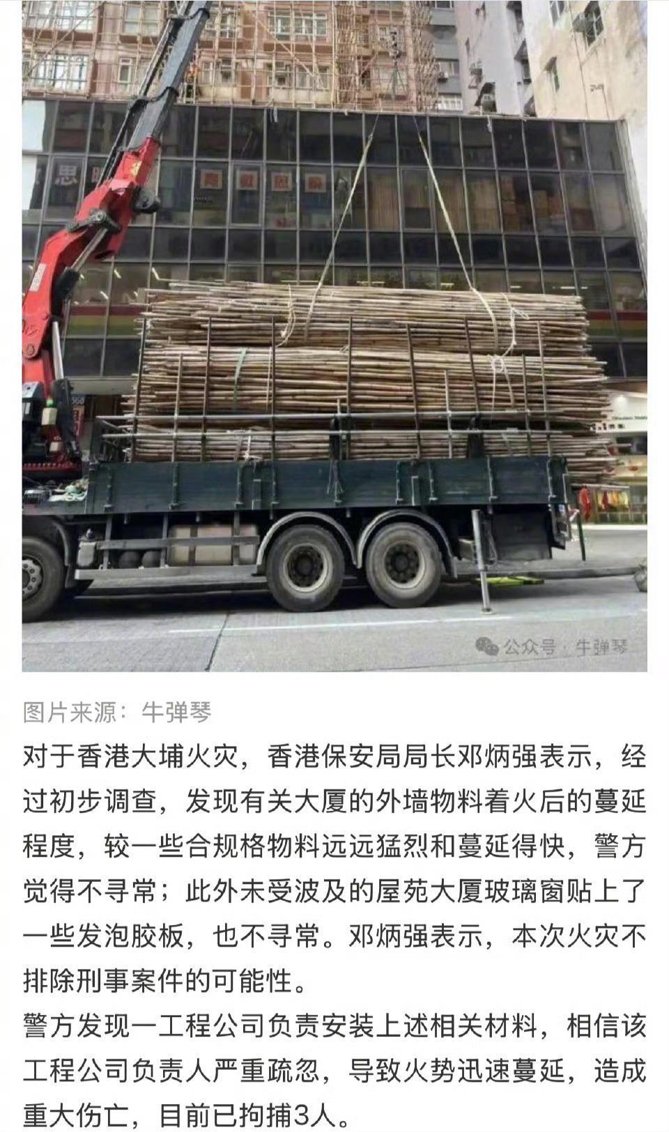 香港为何还在用竹脚手架 香港不可能像内地一样用金属架。香港的基建需求没内地大,地又小,且存储贵,搬运贵,金属架使用成本太高。竹脚手架在香港用了几十年了,且行业里还有个搭棚协会,老师傅们世代做这个,也不太愿意改。这次火灾,警方说不排除刑事案件的可能性。