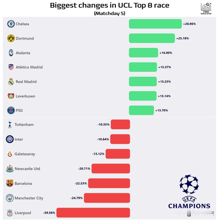 当英超卫冕冠军在安菲尔德被荷甲球队4次洞穿球门,利物浦的崩溃已不仅是战术失利,更是70年未有的系统性崩塌。 目利物浦在争夺欧冠前八名的道路上遭遇沉重打击!在主场1-4不敌埃因霍温后,晋级概率暴跌40%! 5轮仅积6分的红军已跌至小组垫底,出线希望近乎破灭,主帅斯洛特的帅位岌岌可危。 亚特兰大、皇家马德里、马德里竞技、巴黎圣日耳曼的晋级概率均有提升,但切尔西和多特蒙德才是本周最大赢家。