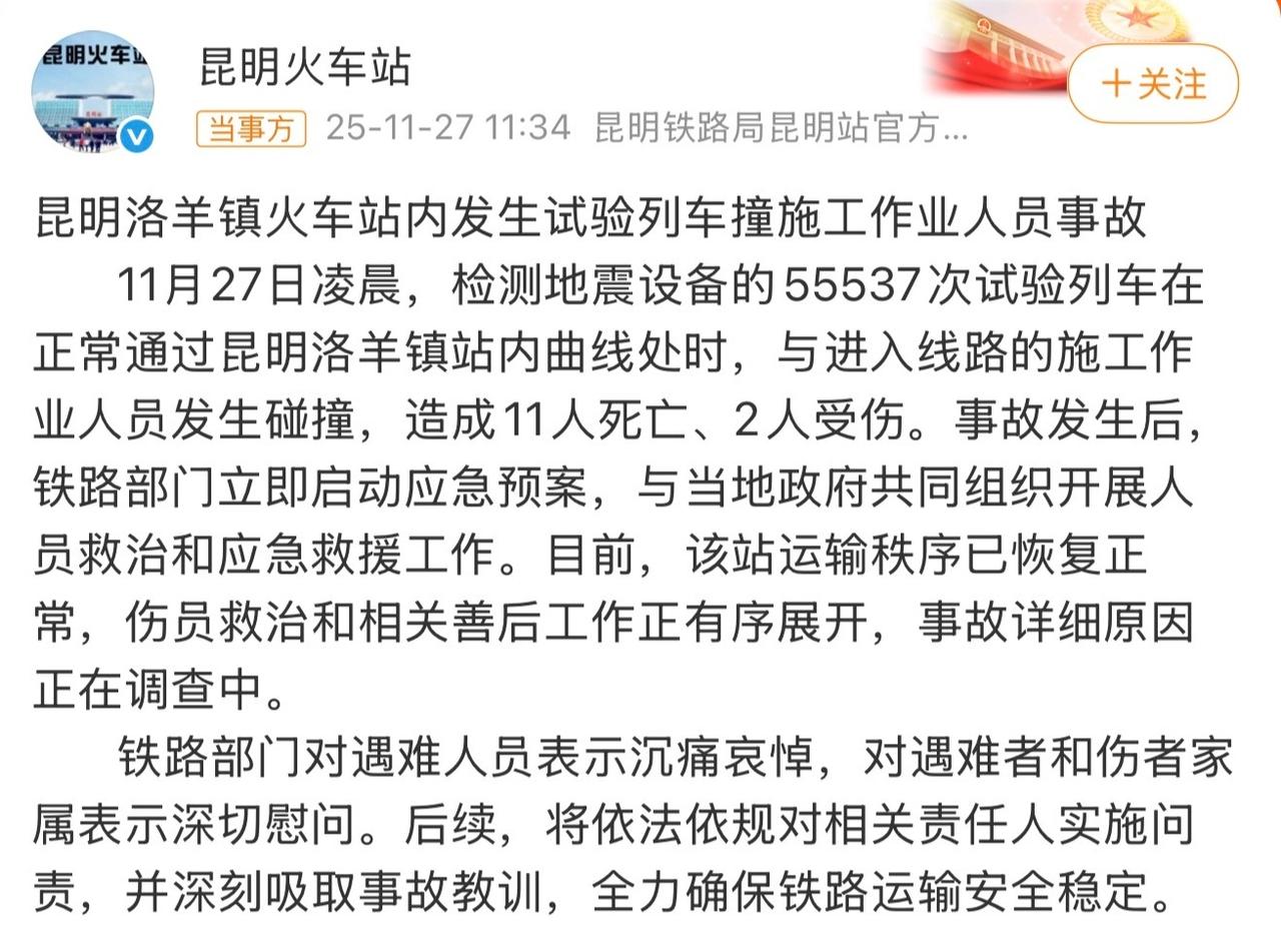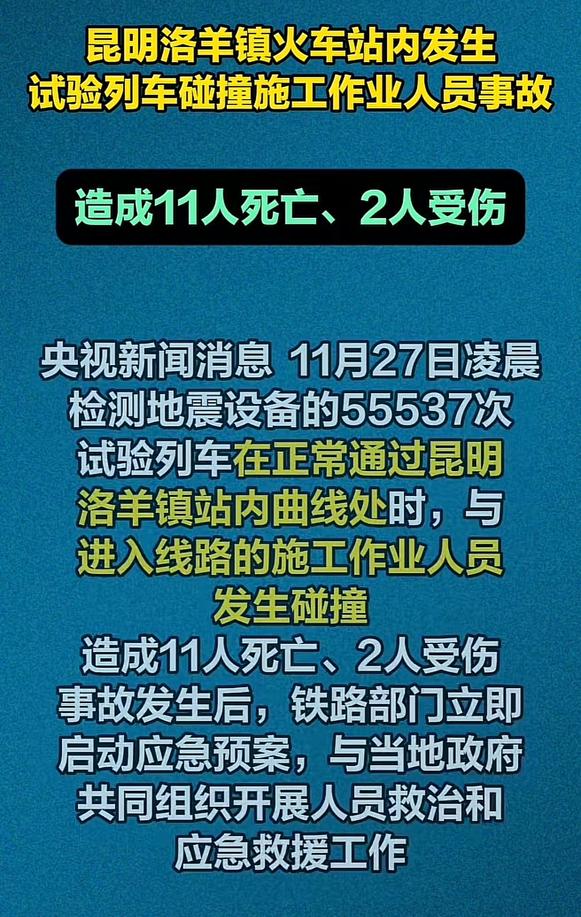 🚨突发!昆明一试验列车凌晨撞上施工人员,致11死2伤,现场太痛心…… 检测地震的55537次列车正常通过洛羊镇站时,与进入线路的作业人员发生碰撞,酿成惨剧。铁路和地方政府火速救援,目前车站秩序已恢复,伤员救治和善后进行中。 铁路部门沉痛哀悼遇难者,并向家属深切慰问,承诺将依法问责、吸取教训,全力保障安全。 生命脆弱,施工安全警钟长鸣!愿逝者安息,伤者早日康复。铁路安全无小事,期待调查结果,杜绝悲剧重演!💔