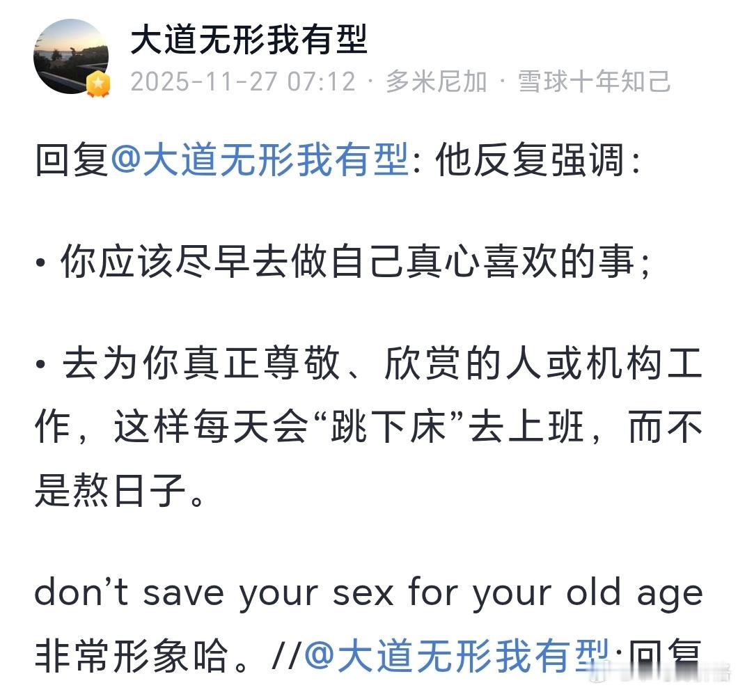 • 你应该尽早去做自己真心喜欢的事;• 去为你真正尊敬、欣赏的人或机构工作,这样
